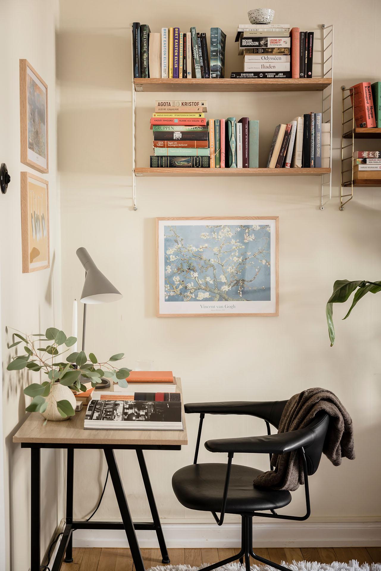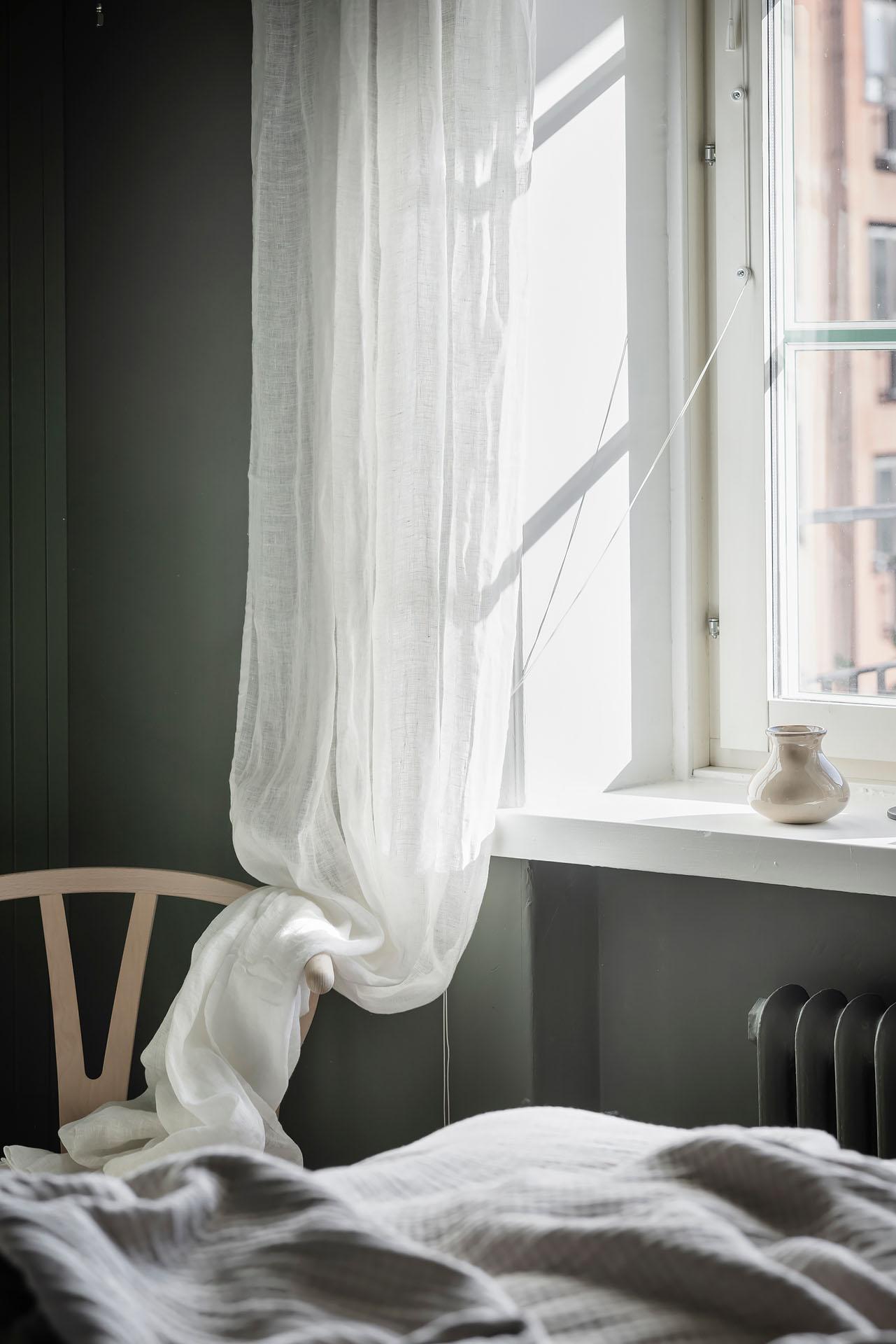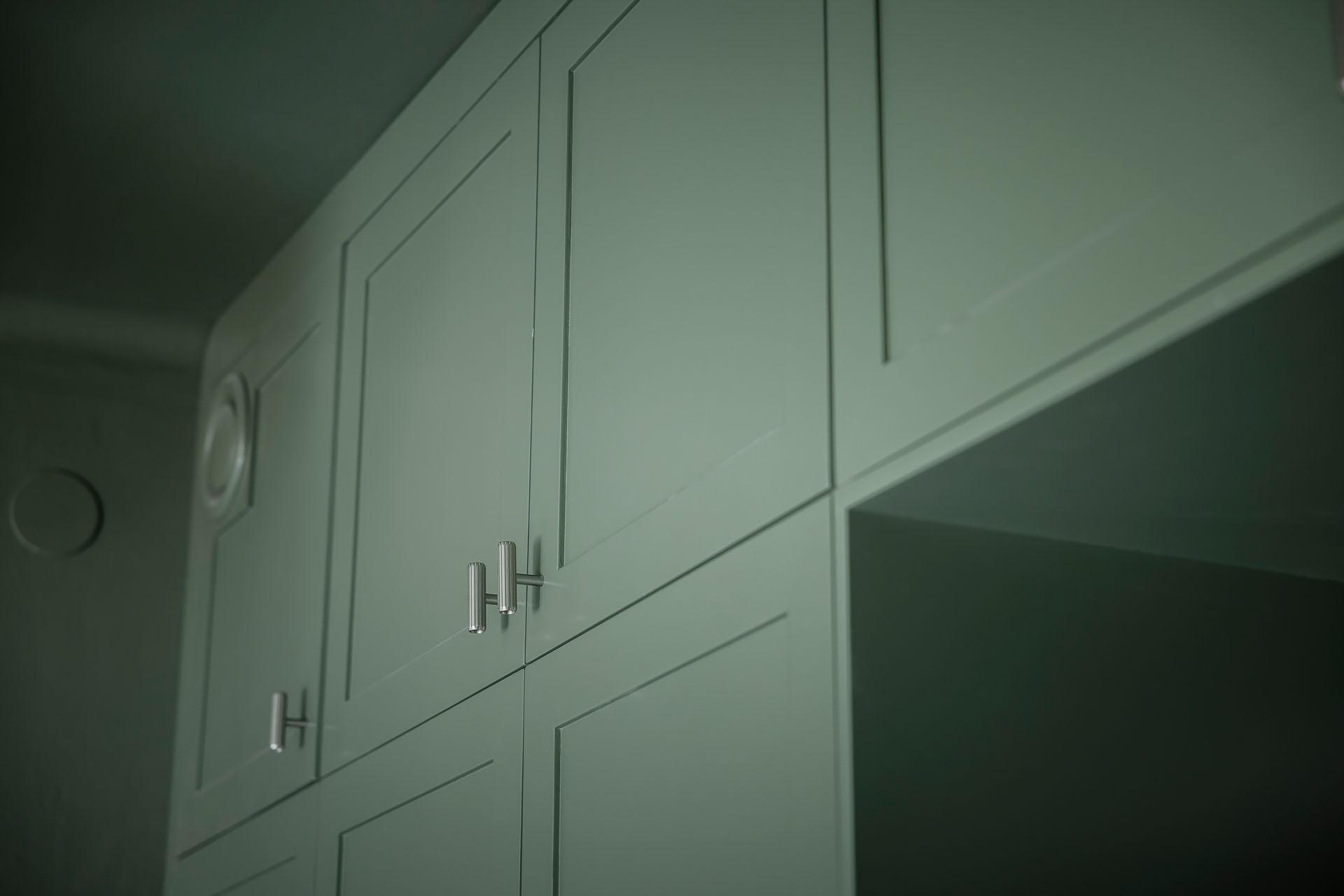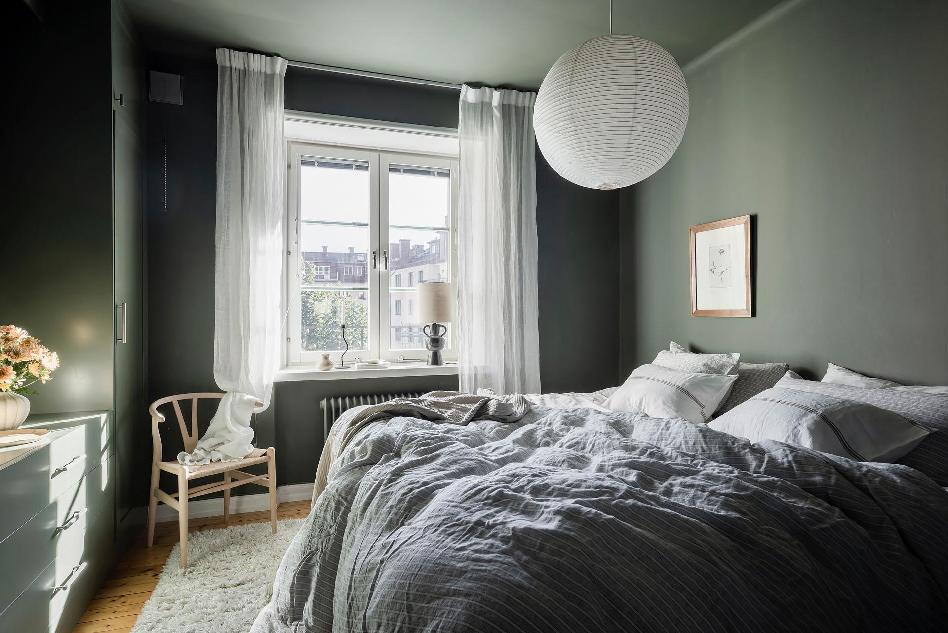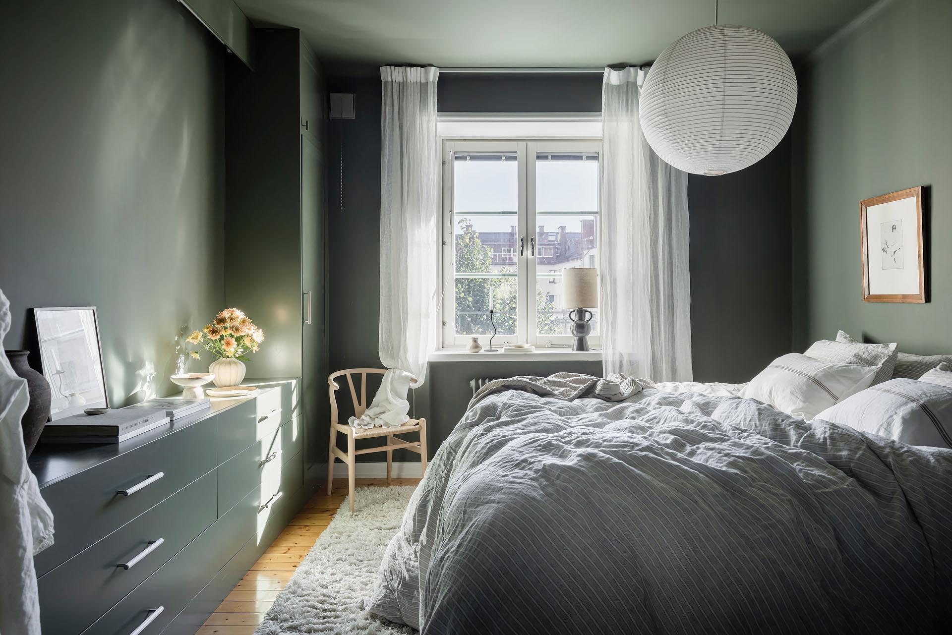 Mot gården ligger sovrummet. Stämningen är vilsam, precis som sig bör i ett sovrum. Närheten till gården gör att rummet upplevs som ett med naturen utan att störa och utan insyn. Väggarna är målad i en harmonisk grön färg och förvaringen är inmålad samma kulör. Här finns plats för en stor dubbelsäng med tillhörande sängbord. Garderoberna platsbyggdes 2025 och har en fin ekpanel på insidan. Här finns gott om förvaring.