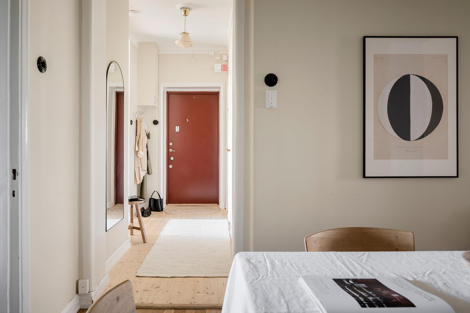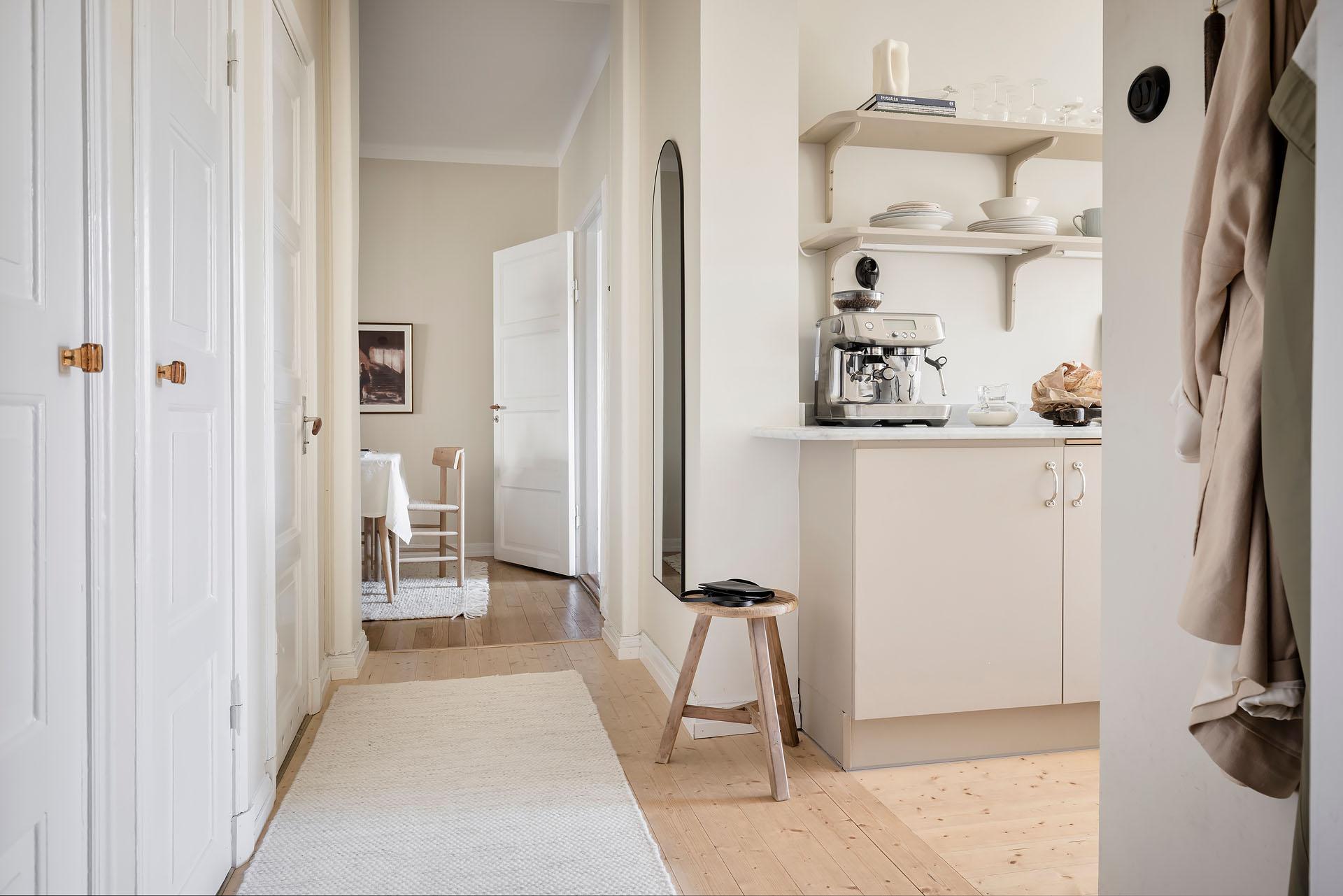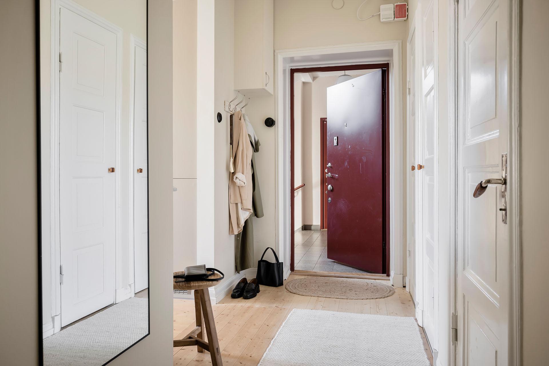 Redan i trapphuset får man en bra känsla för huset, här råder ordning och reda. Ta hissen upp till tredje våningen. När du stiger innanför den massiva säkerhetsdörren i lägenheten välkomnas du av en rymlig hall med goda förvaringsmöjligheter i form av två klädkammare. Hallen är i lägenhetens centrum, härifrån når du köket och badrummet men även vidare in mot de andra rummen. På golvet ligger ett vackert plankgolv som går vidare in i lägenhetens kök.