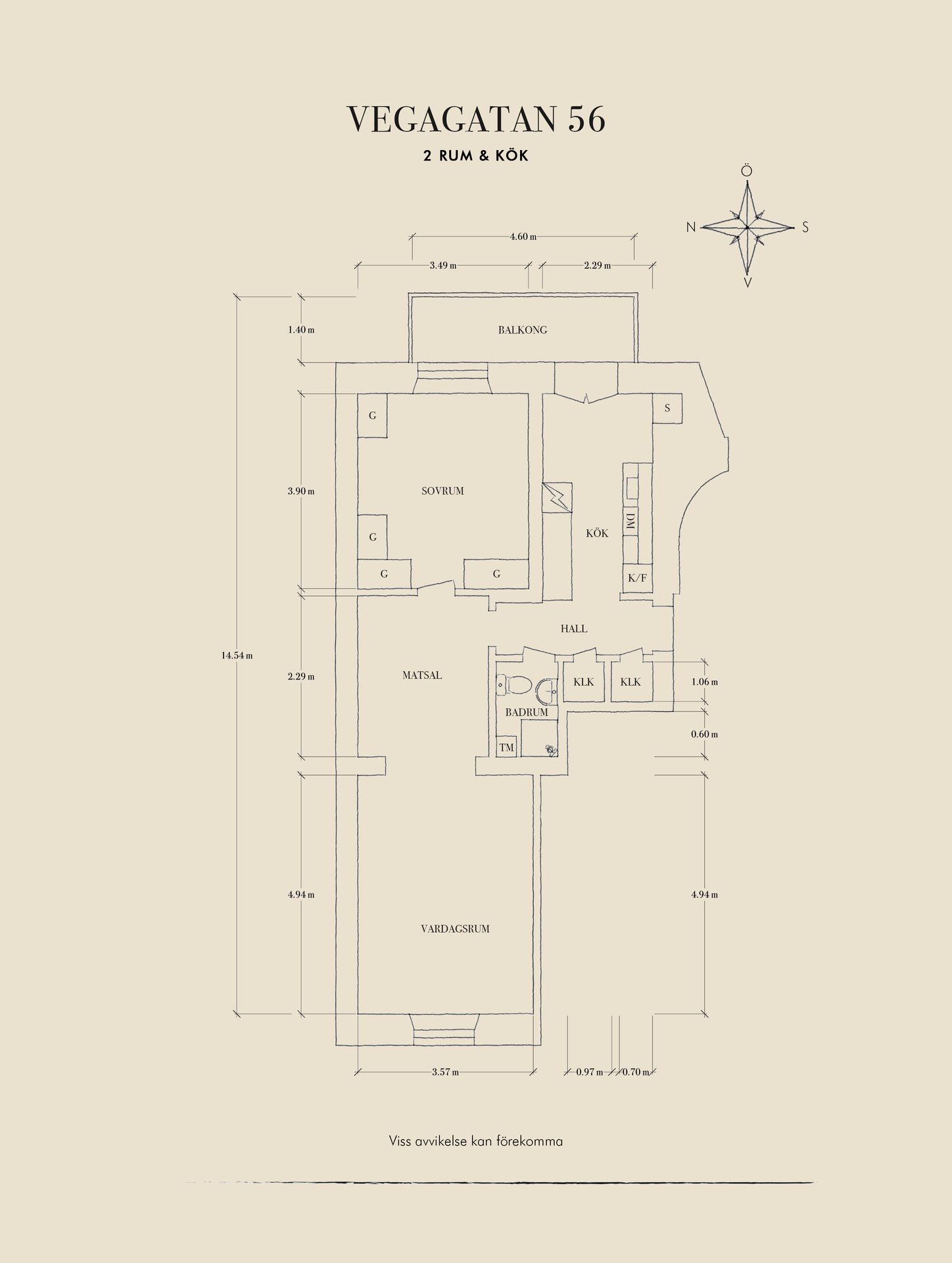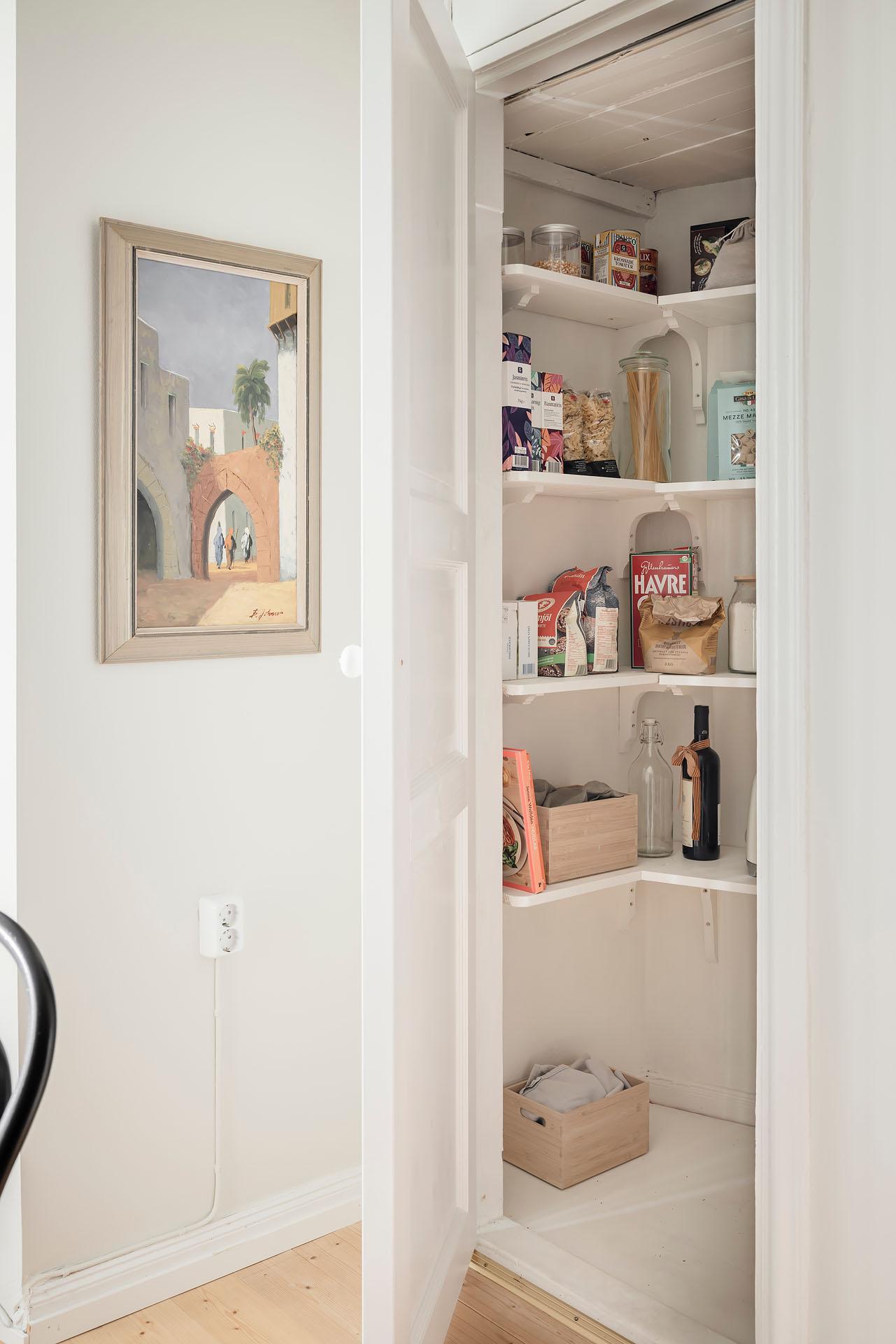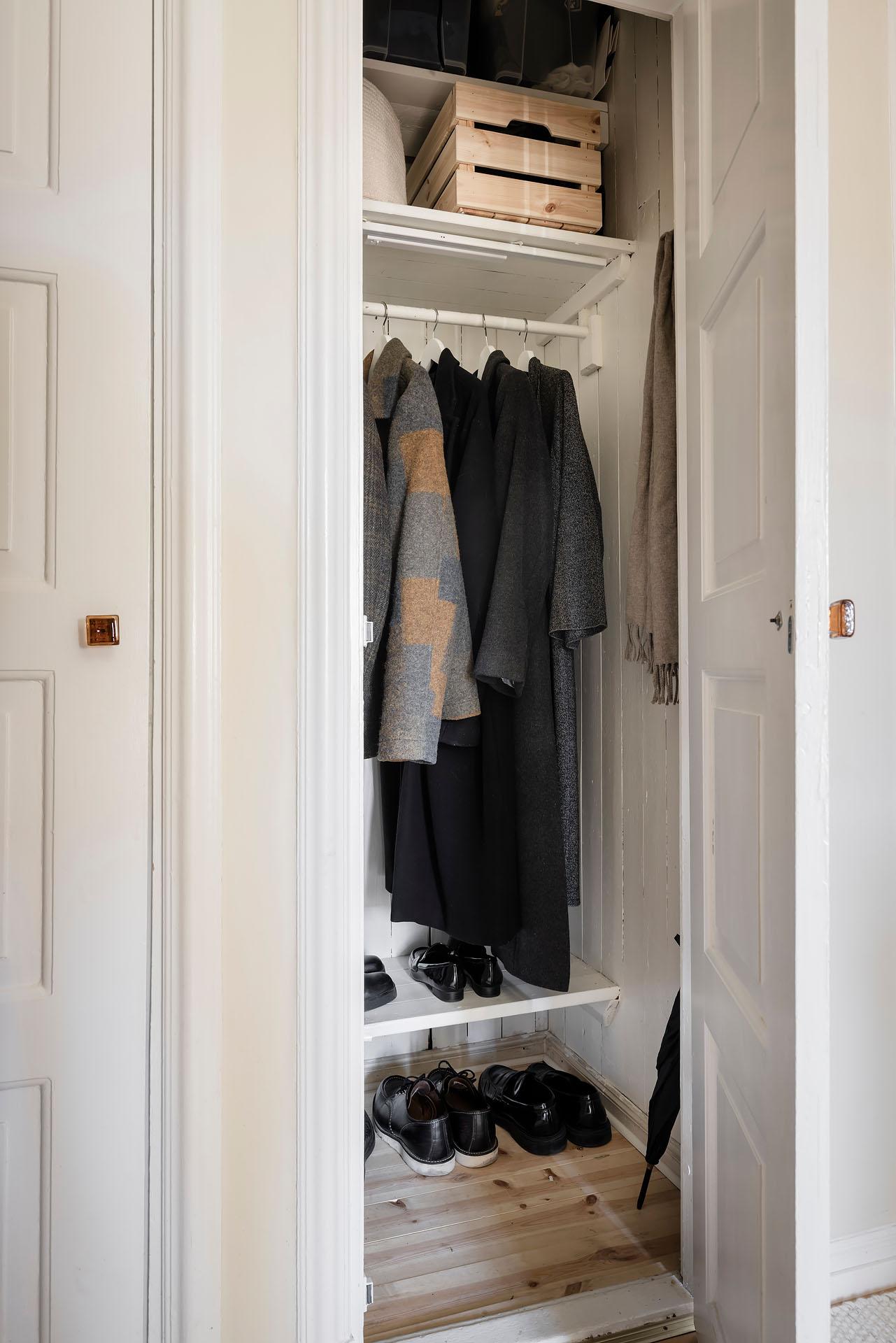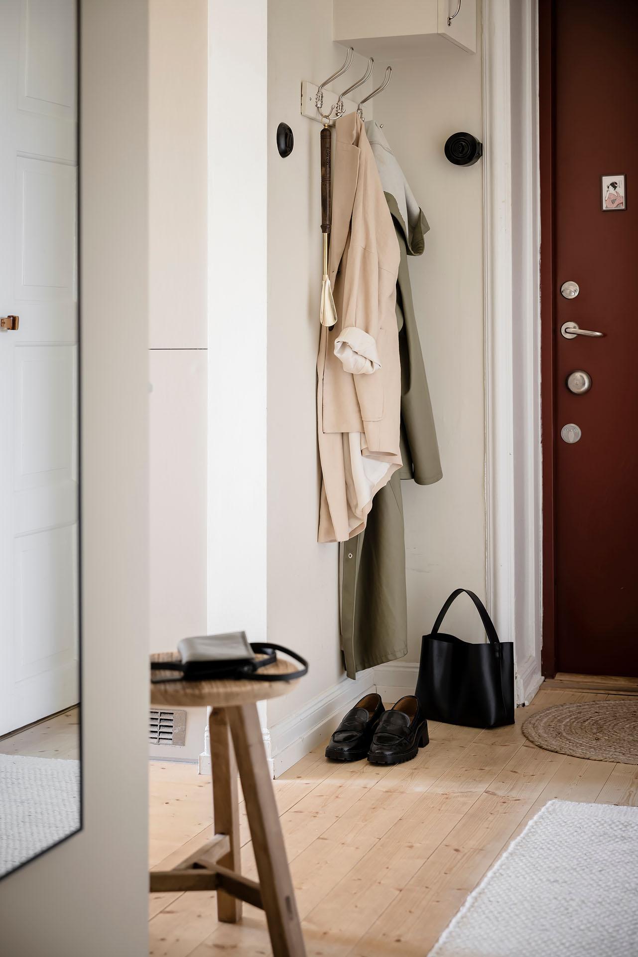 Redan i trapphuset får man en bra känsla för huset, här råder ordning och reda. Ta hissen upp till tredje våningen. När du stiger innanför den massiva säkerhetsdörren i lägenheten välkomnas du av en rymlig hall med goda förvaringsmöjligheter i form av två klädkammare. Hallen är i lägenhetens centrum, härifrån når du köket och badrummet men även vidare in mot de andra rummen. På golvet ligger ett vackert plankgolv som går vidare in i lägenhetens kök.
