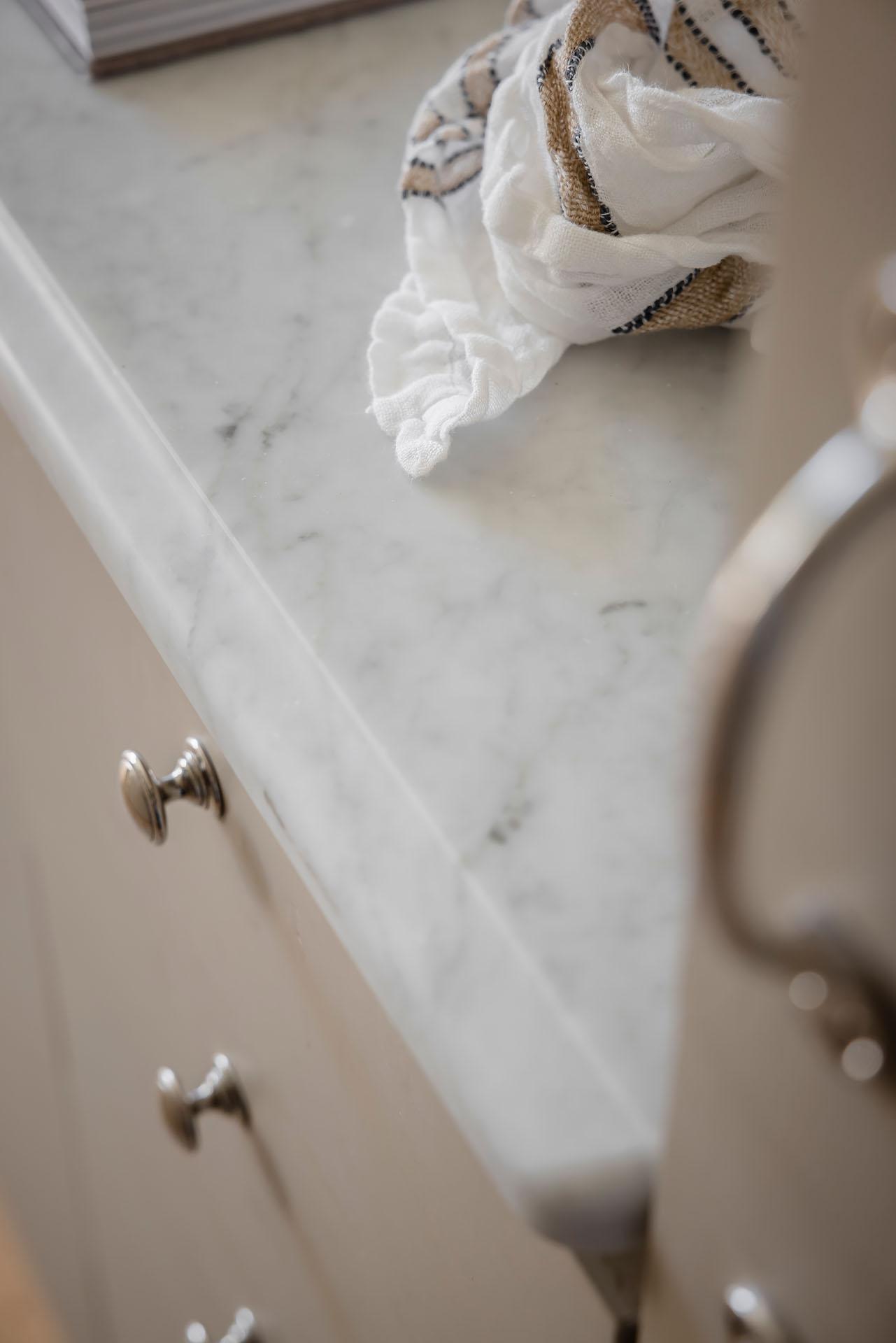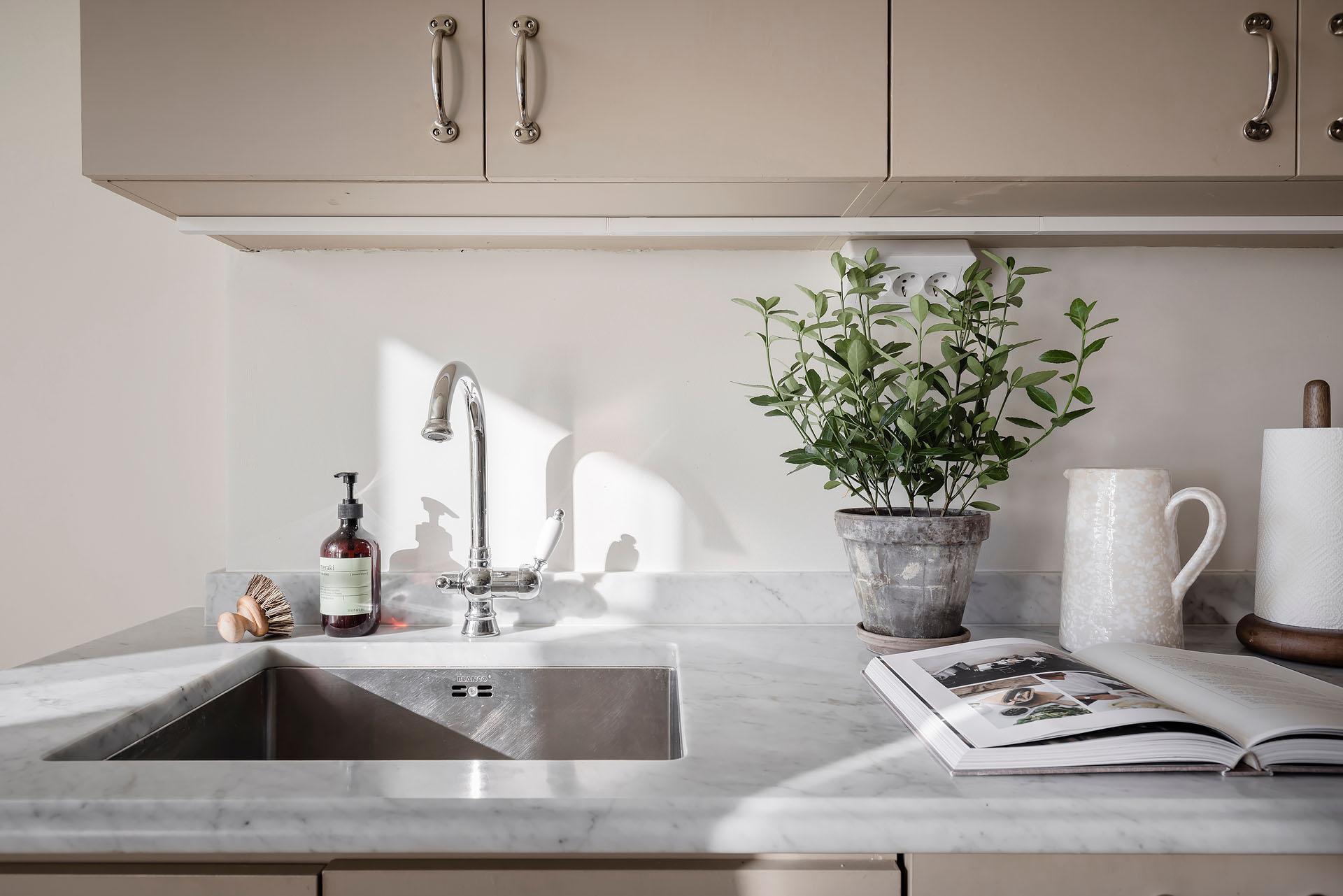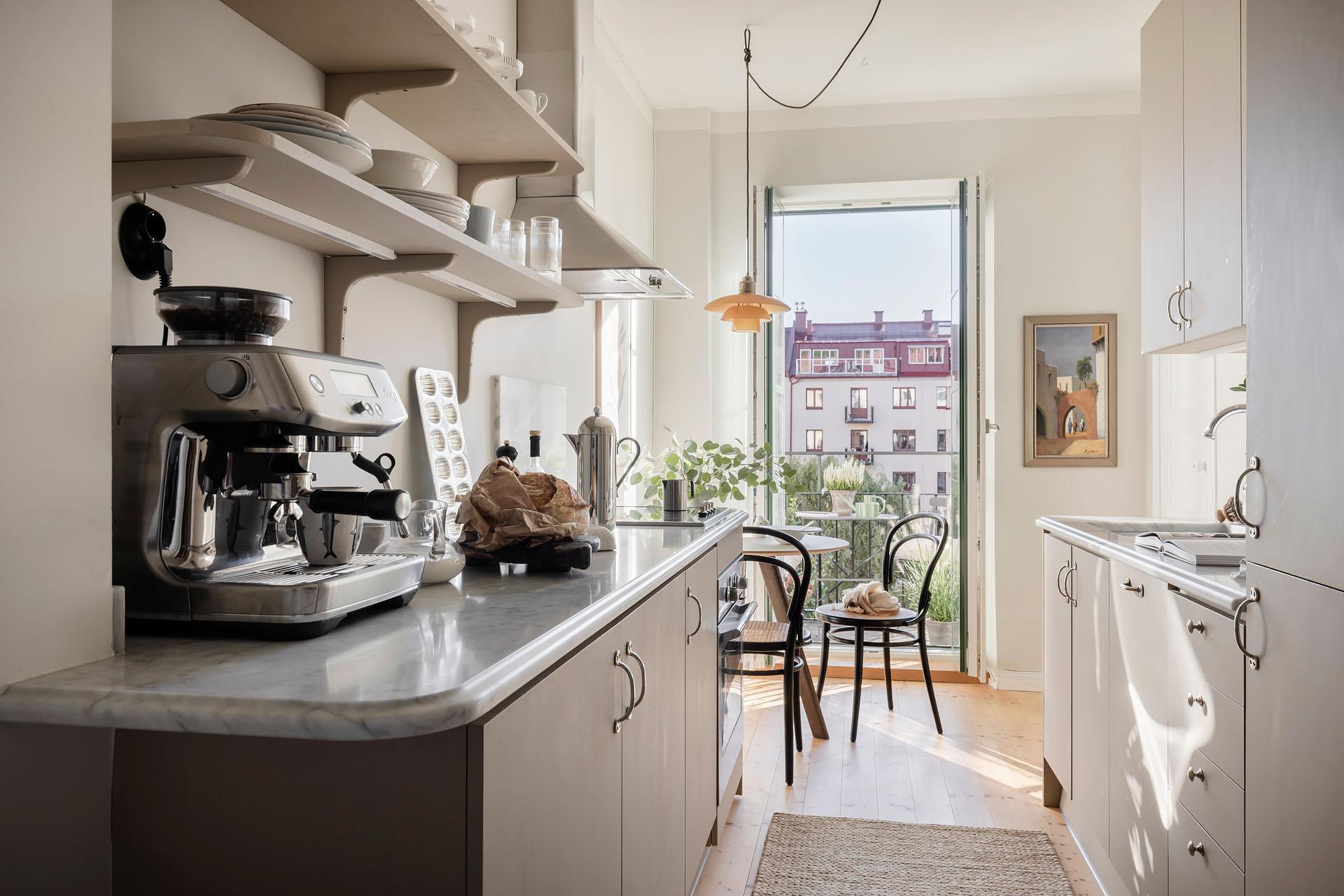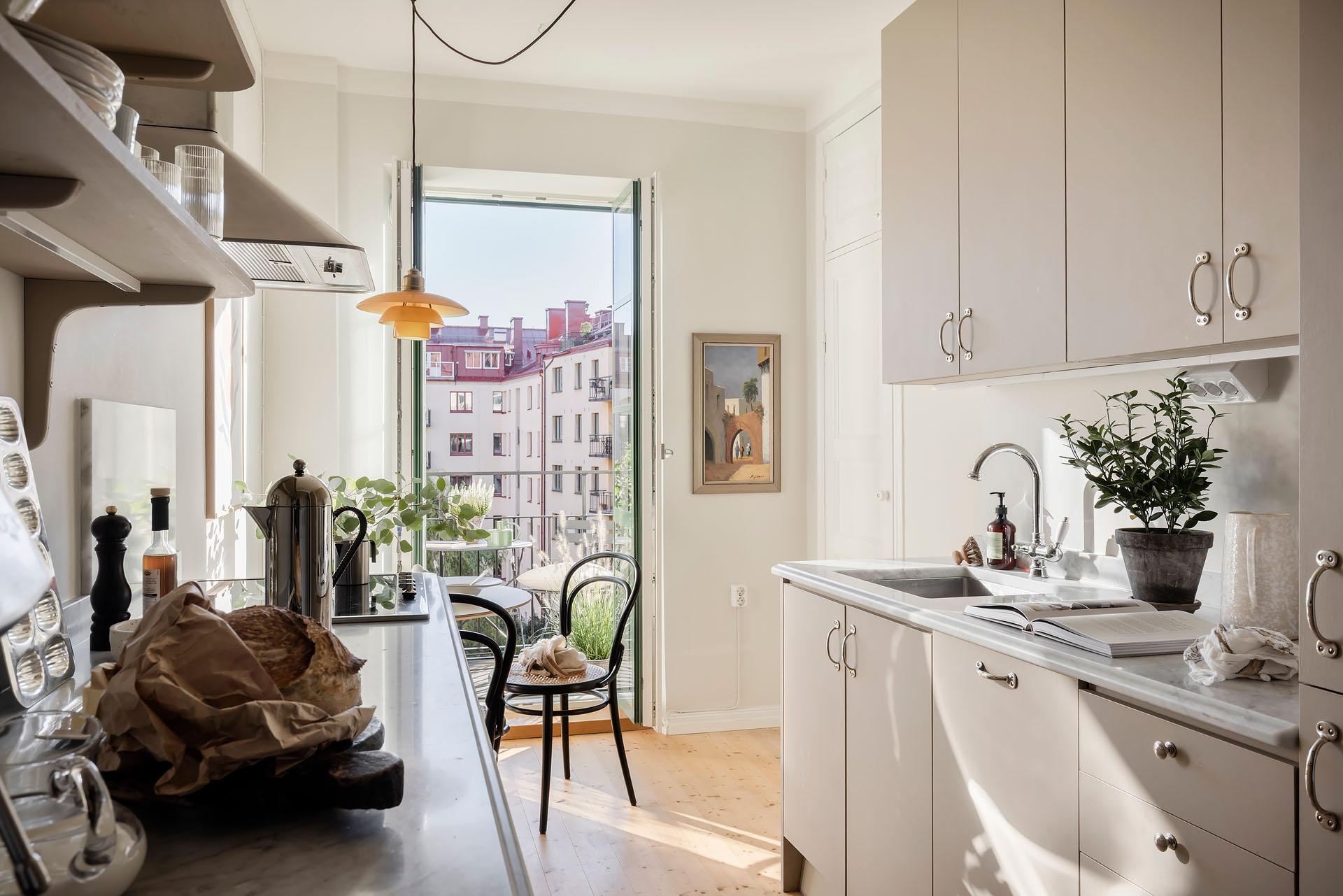 Det renoverades 2025. Detta är ett luftigt och smakfullt kök med mycket arbetsytor. Beiga stilrena skåpsluckor med en marmorskiva med stänkskydd. Vitvaror i form av en diskmaskin, induktionshäll och spis. Kyl/frys har smakfullt integrerats och här finns dessutom ett inbyggt skafferi.