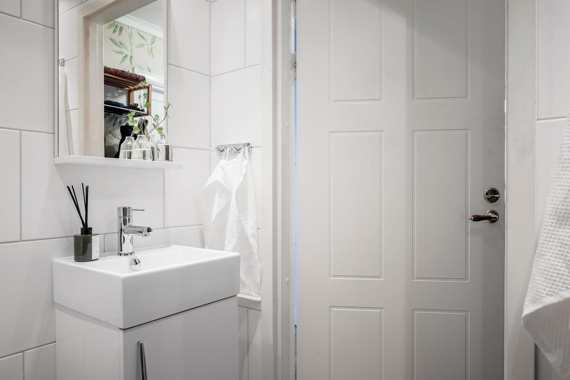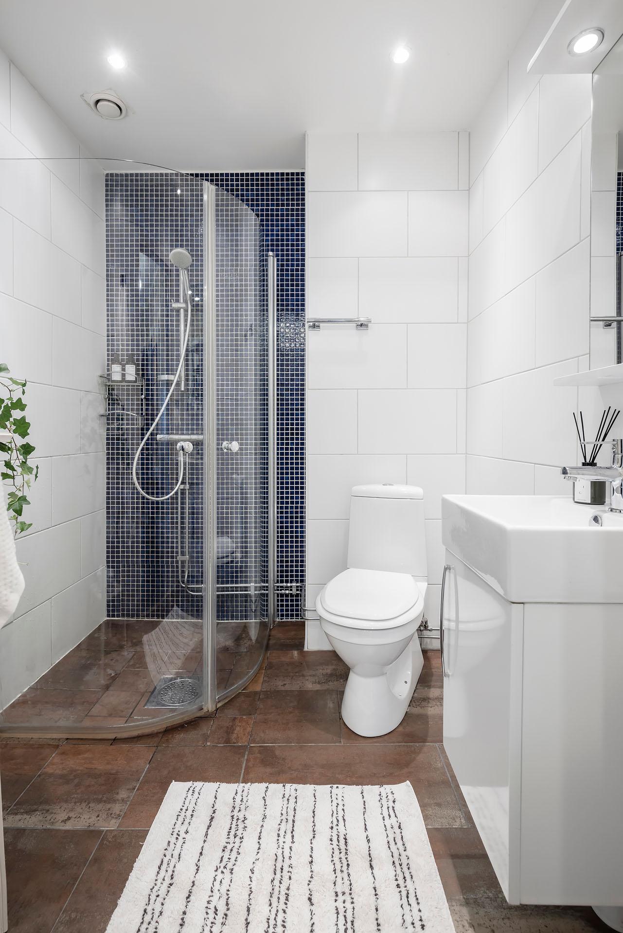 Badrummet renoverades 2008 av fackmän och är helkaklat i klassiska toner. Golvet har varmbrun klinker som möter vitt kakel på väggarna, och i duschen bryter en indigoblå mosaik av. Här finns golvvärme samt framdragen el och avlopp för tvättmaskin.