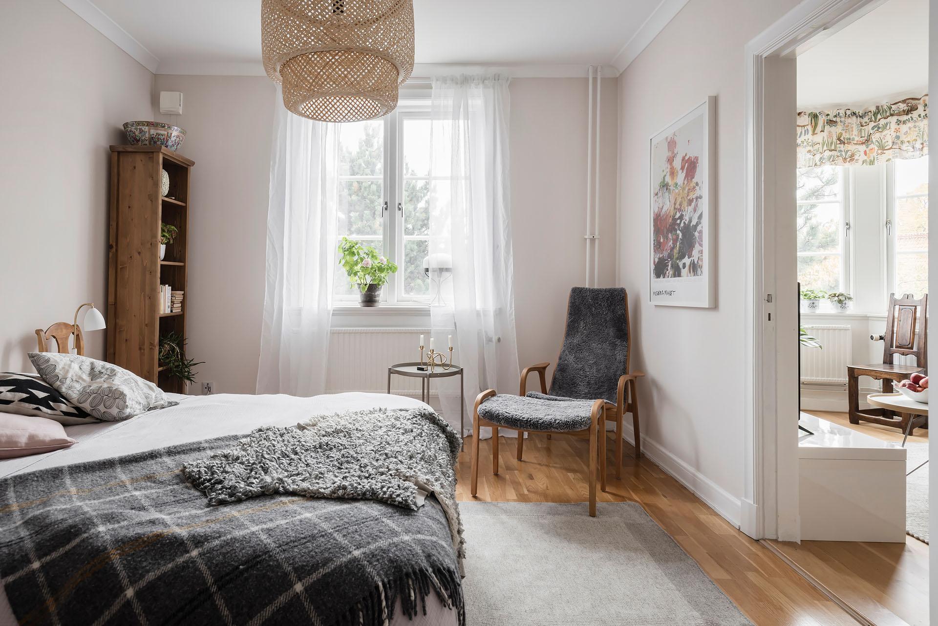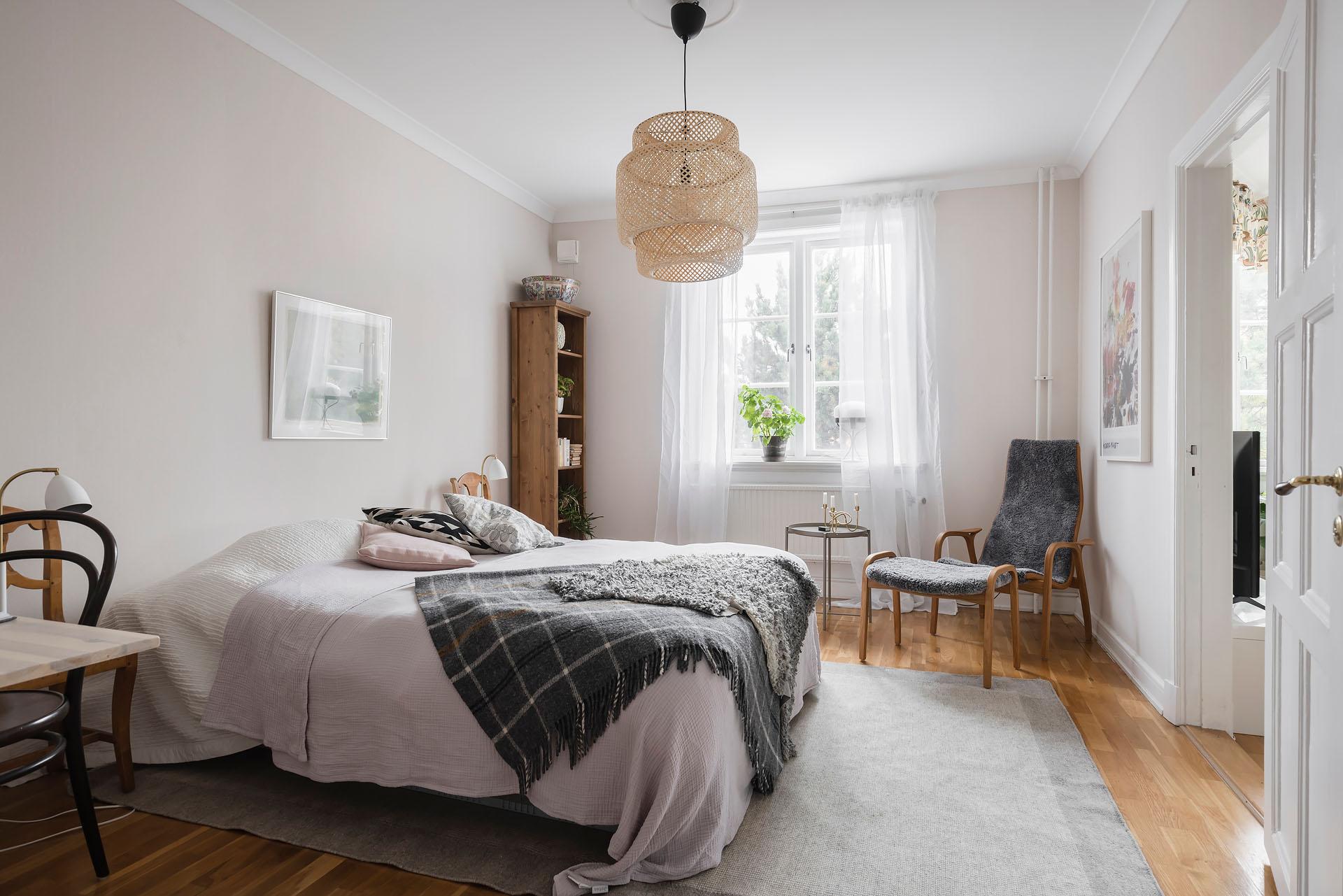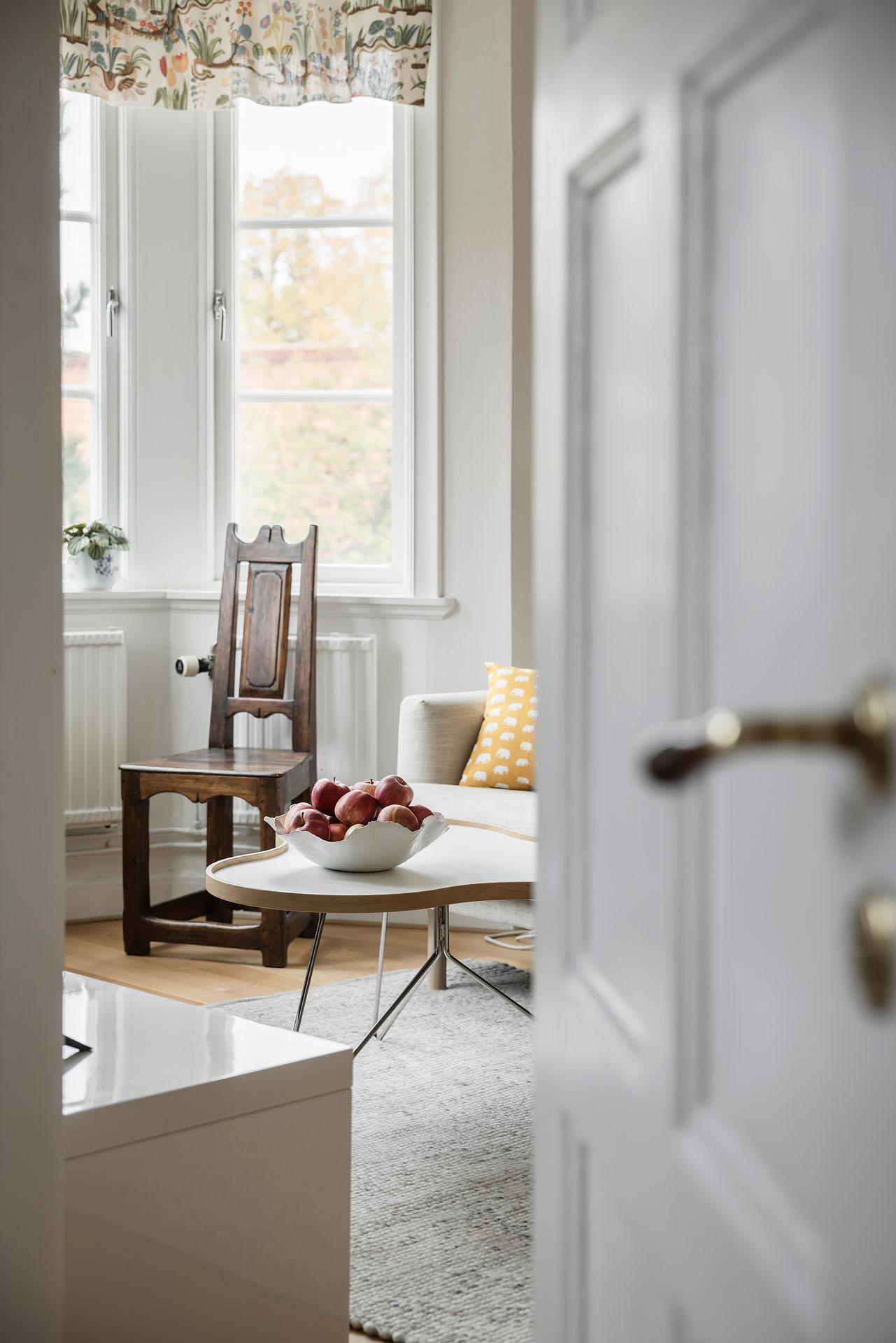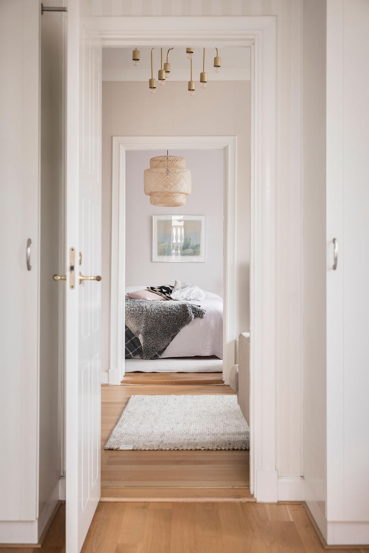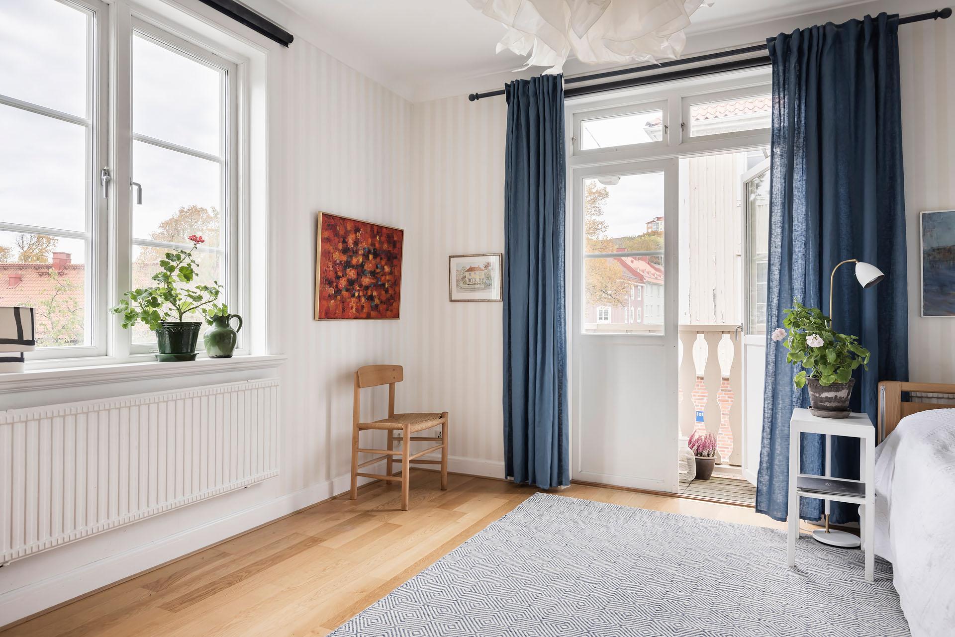 Från köket nås hörnrummet med ljusinsläpp från två väderstreck och utgång till balkongen – en av få i Bagaregården. I dag används rummet som sovrum, men dess storlek och ljus gör det lika lämpat som vardagsrum. Den som gillar öppna planlösningar får säkert kittel i renoveringsfingrarna av tanken på att öppna upp väggen mot det intilliggande köket. Tapeten, en diskret rand i vitt och beige från Boråstapeter, skapar en lugn och inbjudande känsla.
