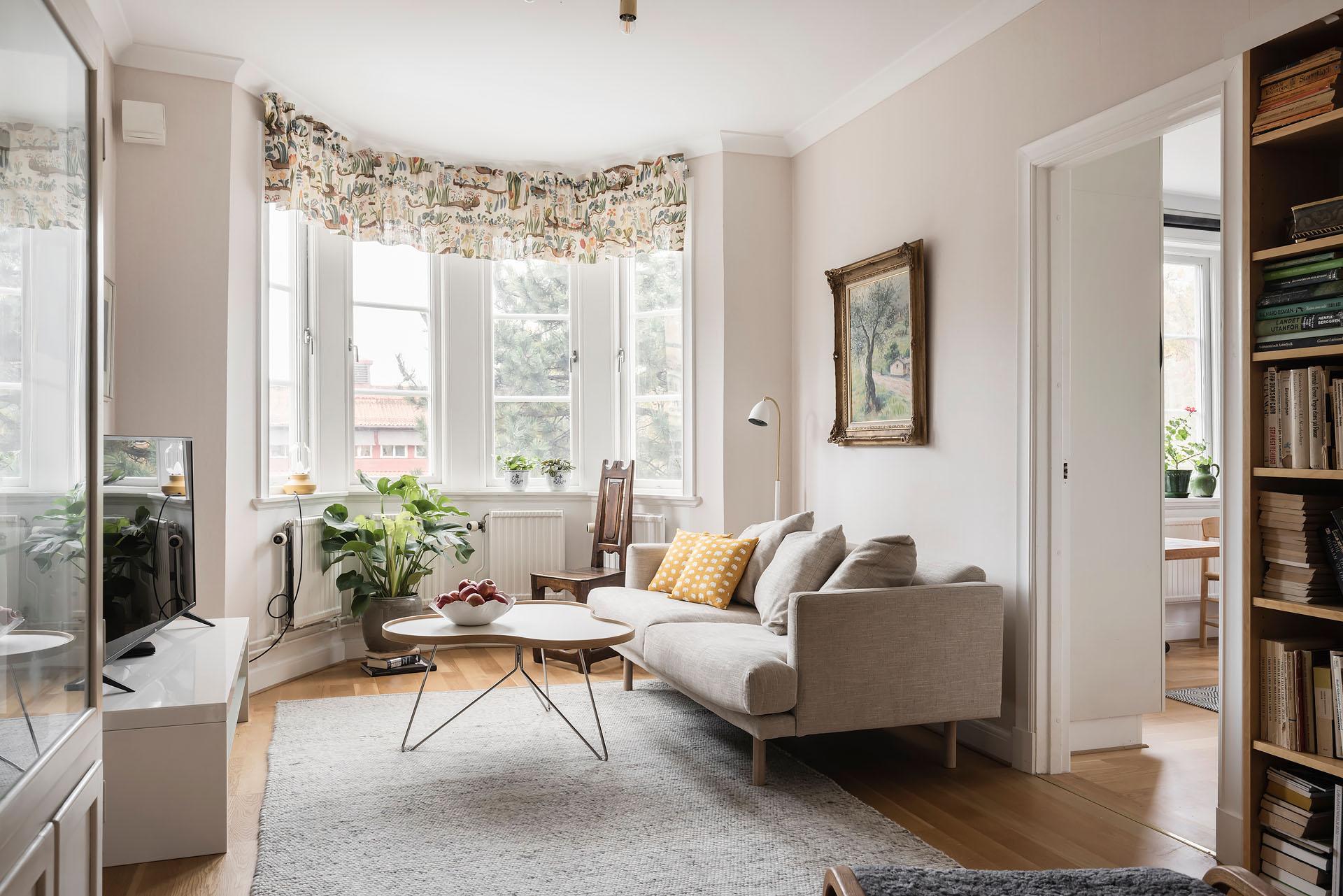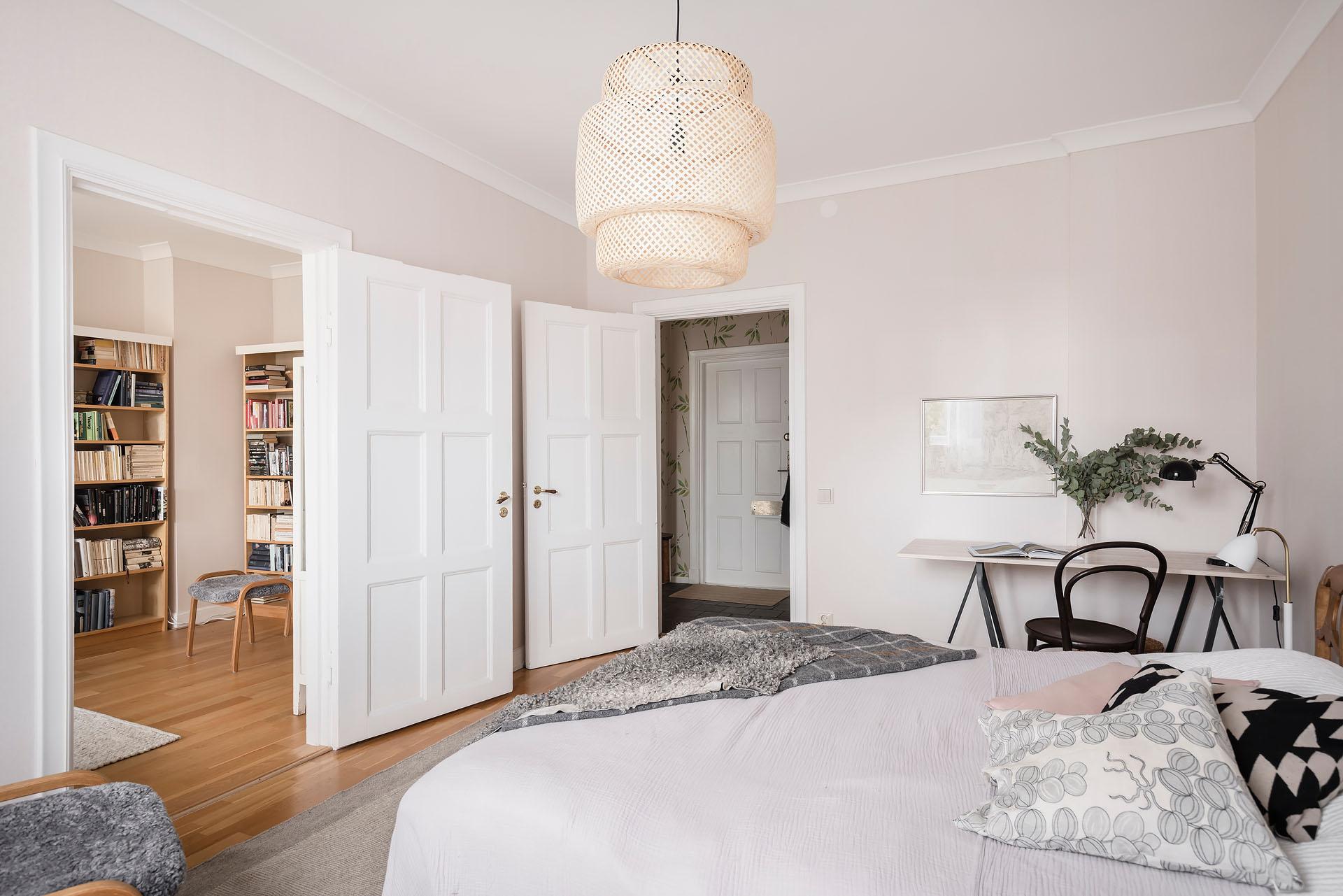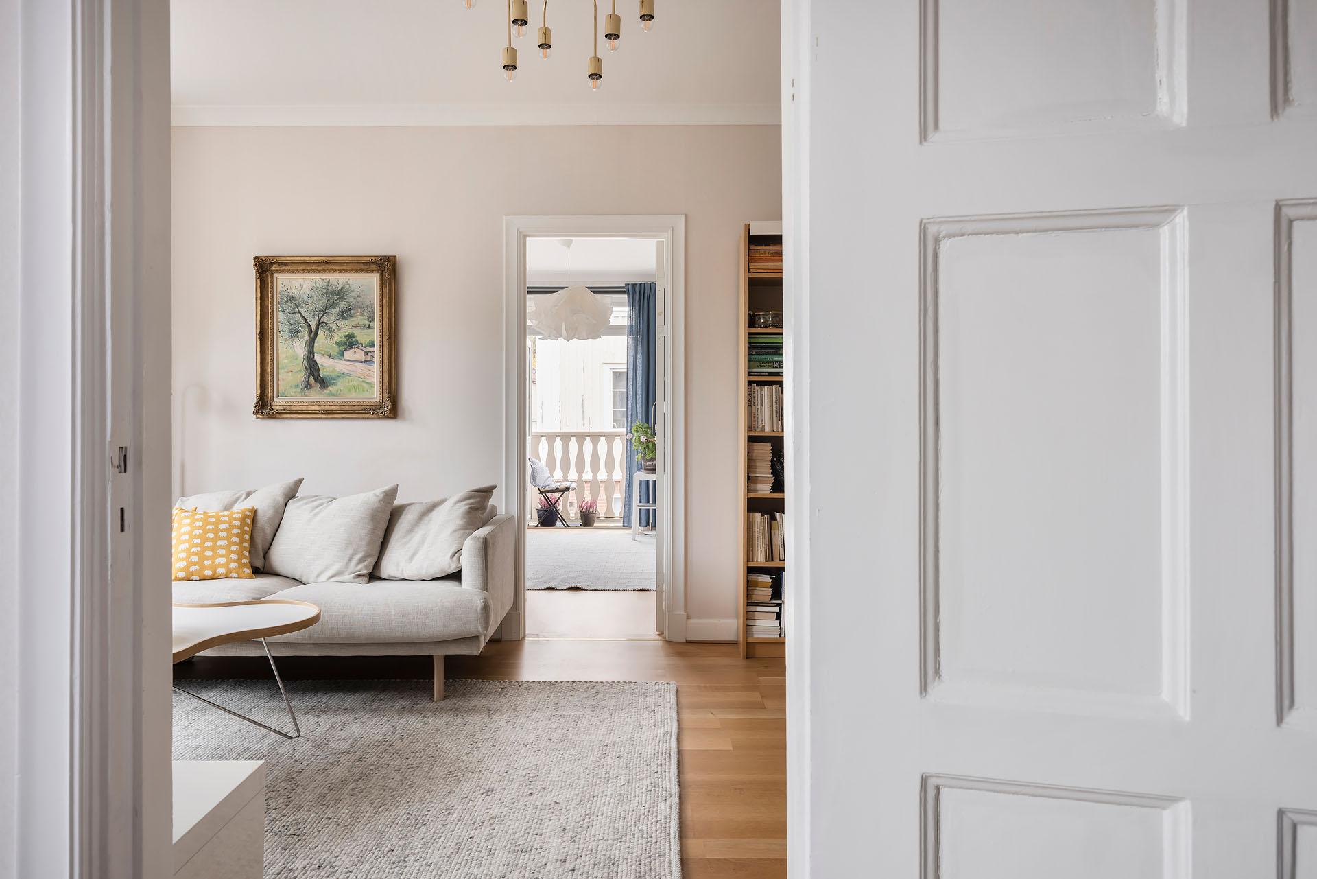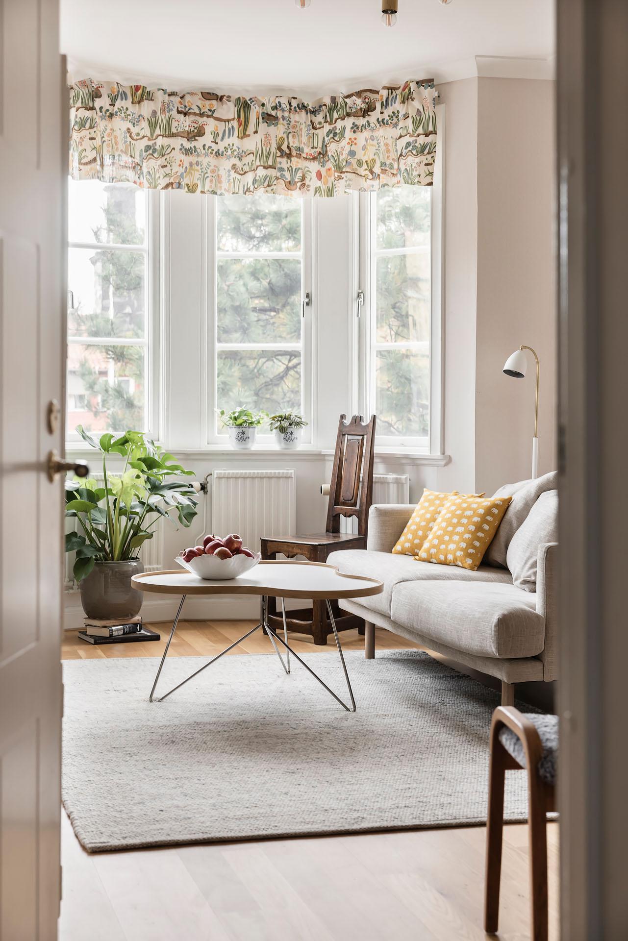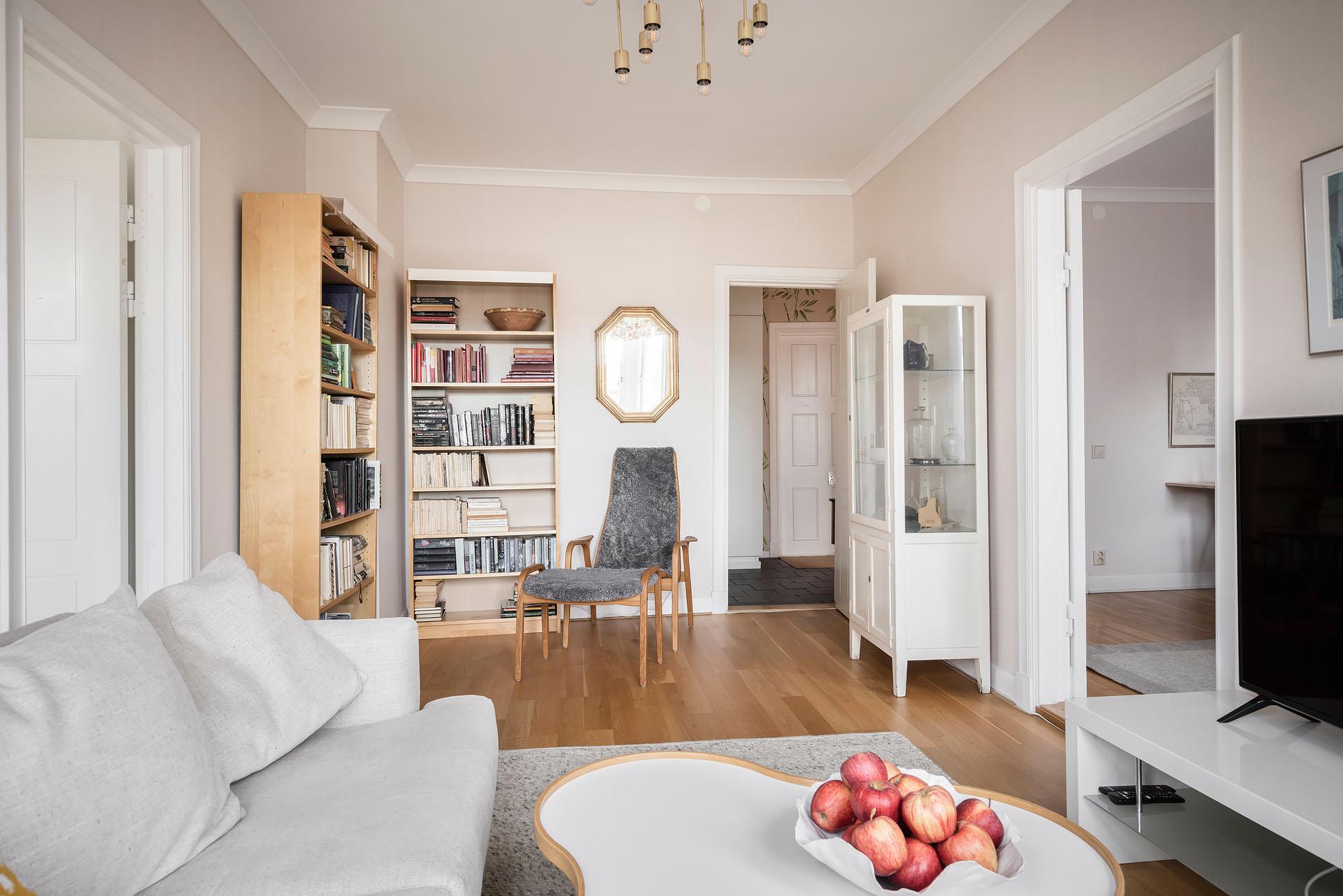 Från köket nås hörnrummet med ljusinsläpp från två väderstreck och utgång till balkongen – en av få i Bagaregården. I dag används rummet som sovrum, men dess storlek och ljus gör det lika lämpat som vardagsrum. Den som gillar öppna planlösningar får säkert kittel i renoveringsfingrarna av tanken på att öppna upp väggen mot det intilliggande köket. Tapeten, en diskret rand i vitt och beige från Boråstapeter, skapar en lugn och inbjudande känsla.