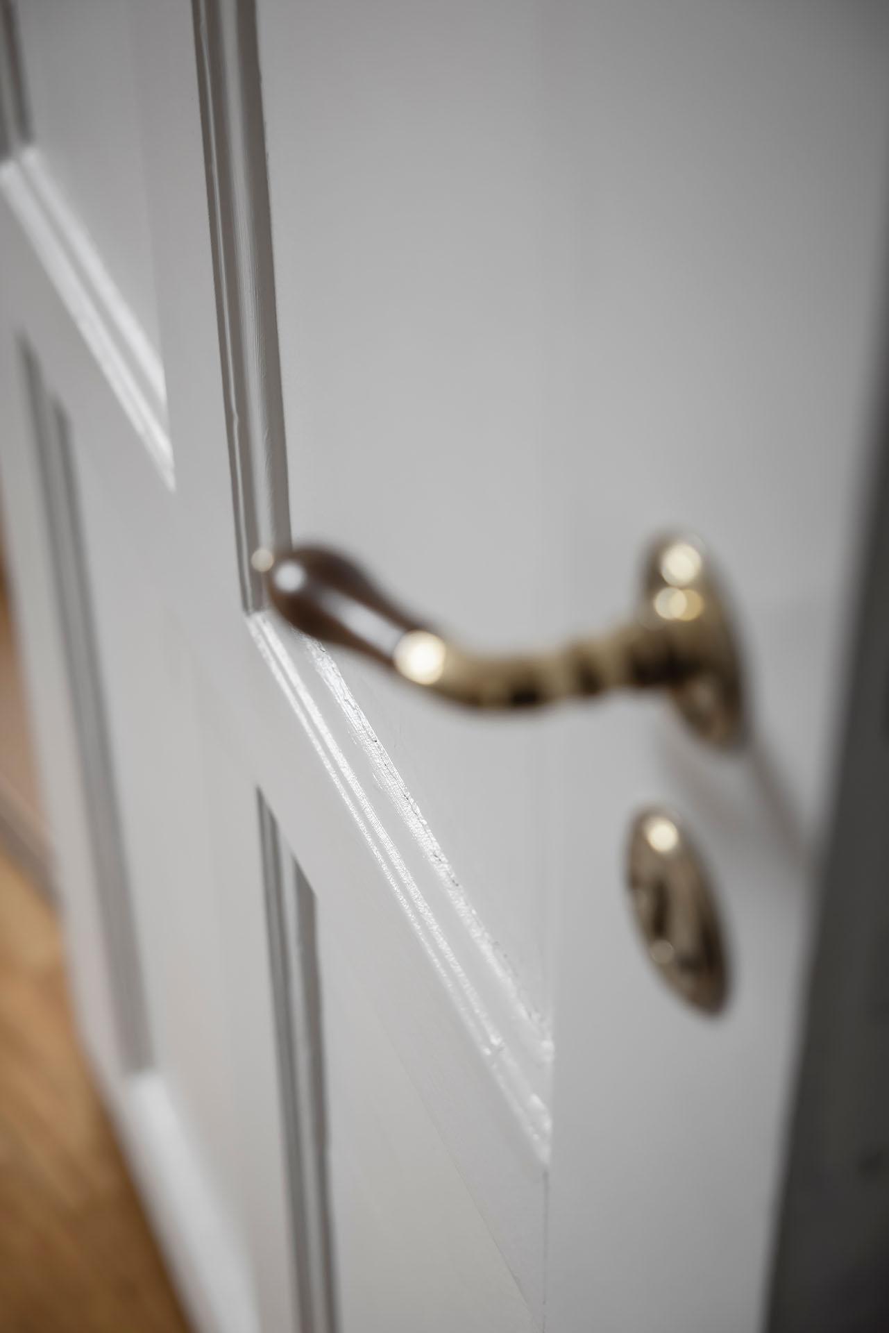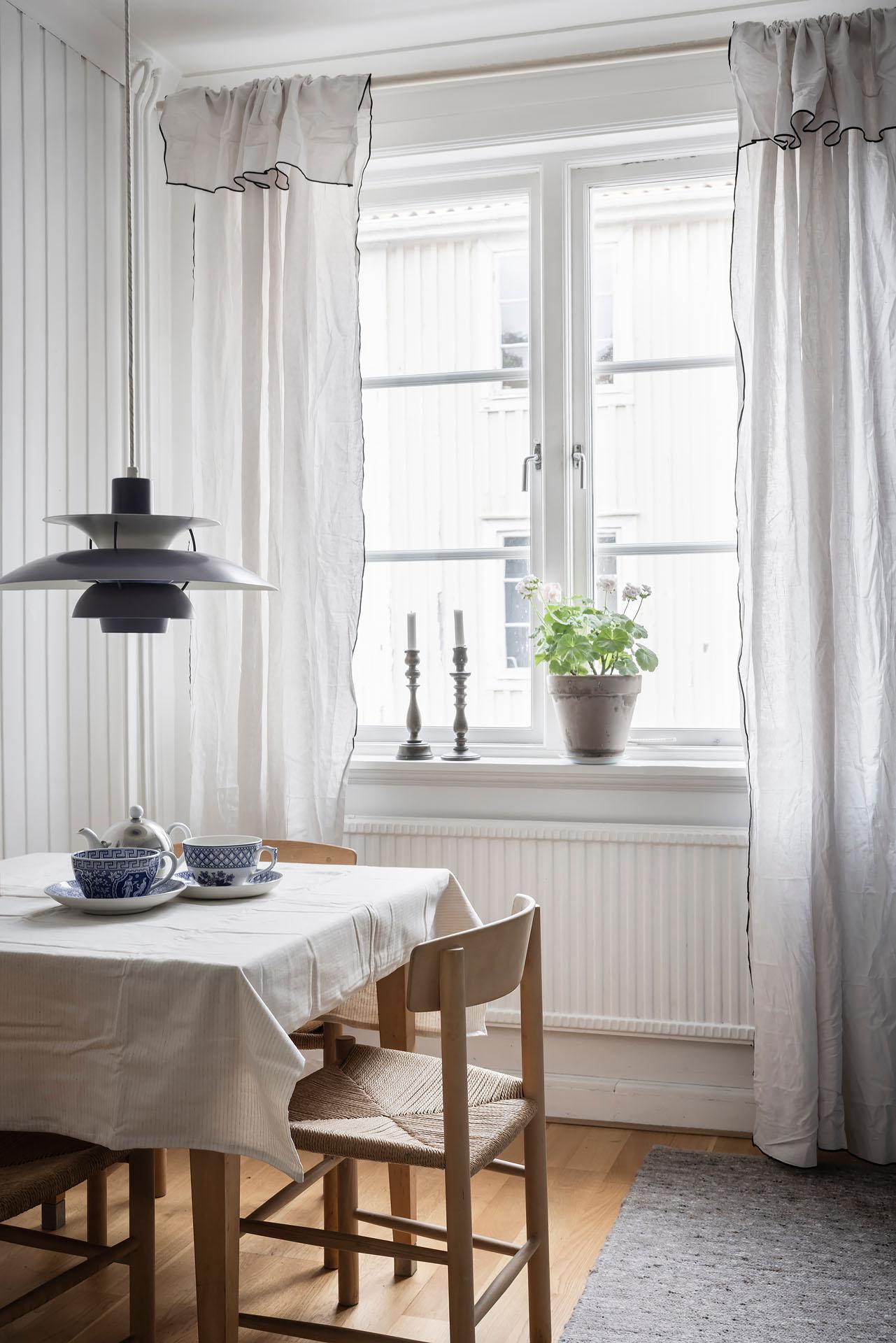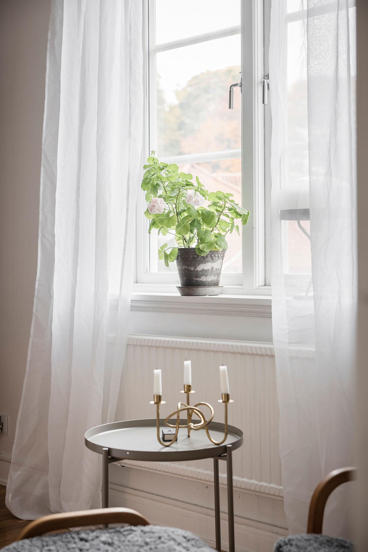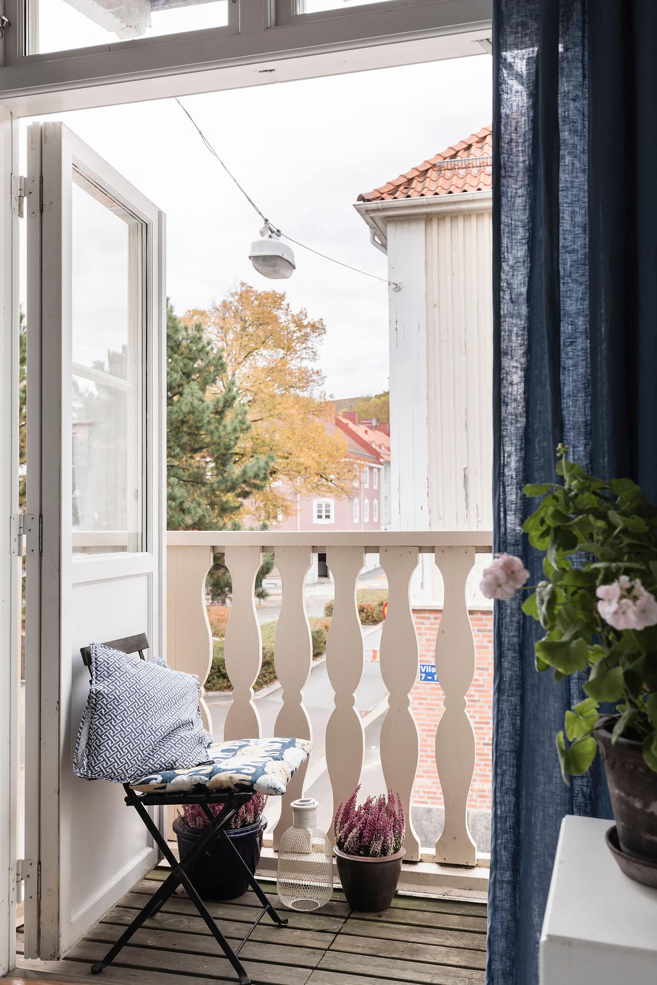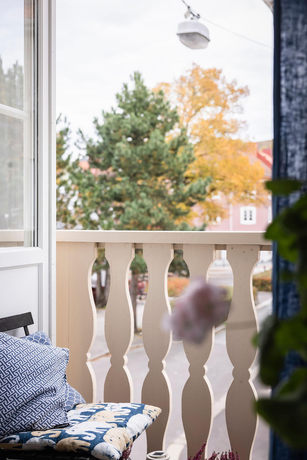 Från köket nås hörnrummet med ljusinsläpp från två väderstreck och utgång till balkongen – en av få i Bagaregården. I dag används rummet som sovrum, men dess storlek och ljus gör det lika lämpat som vardagsrum. Den som gillar öppna planlösningar får säkert kittel i renoveringsfingrarna av tanken på att öppna upp väggen mot det intilliggande köket. Tapeten, en diskret rand i vitt och beige från Boråstapeter, skapar en lugn och inbjudande känsla.