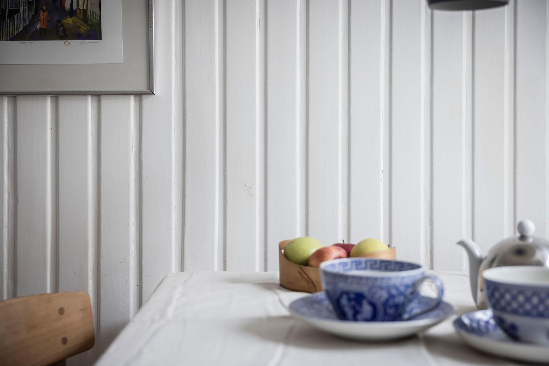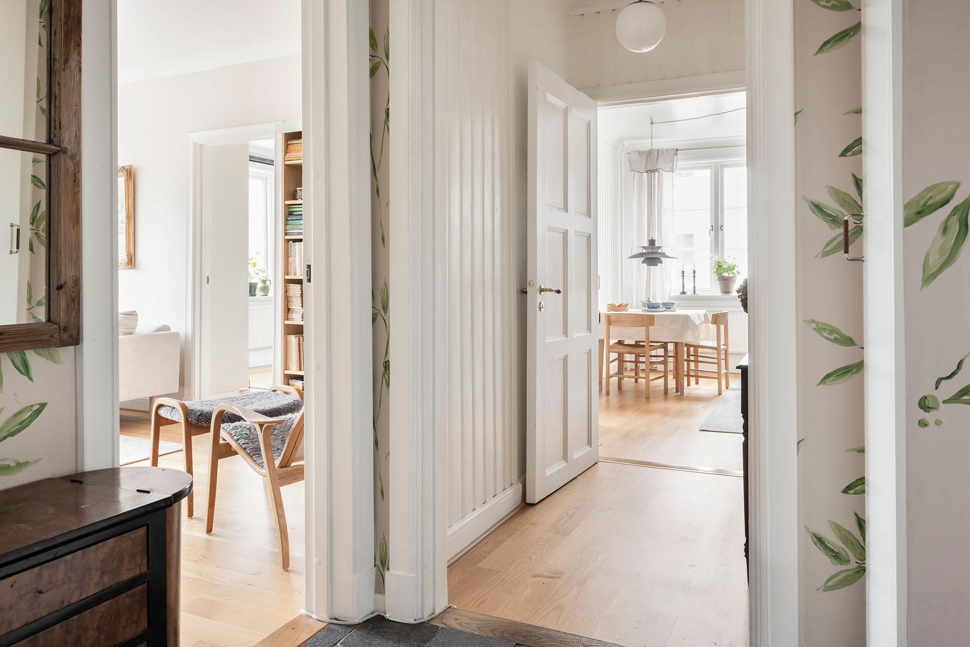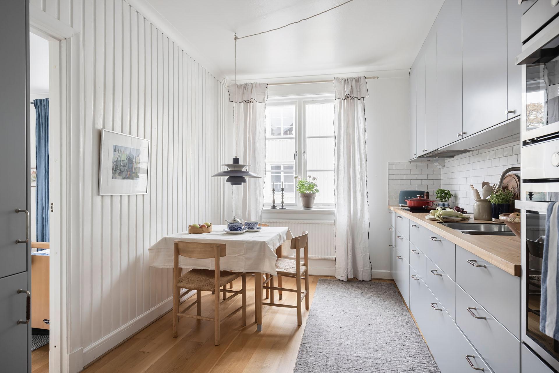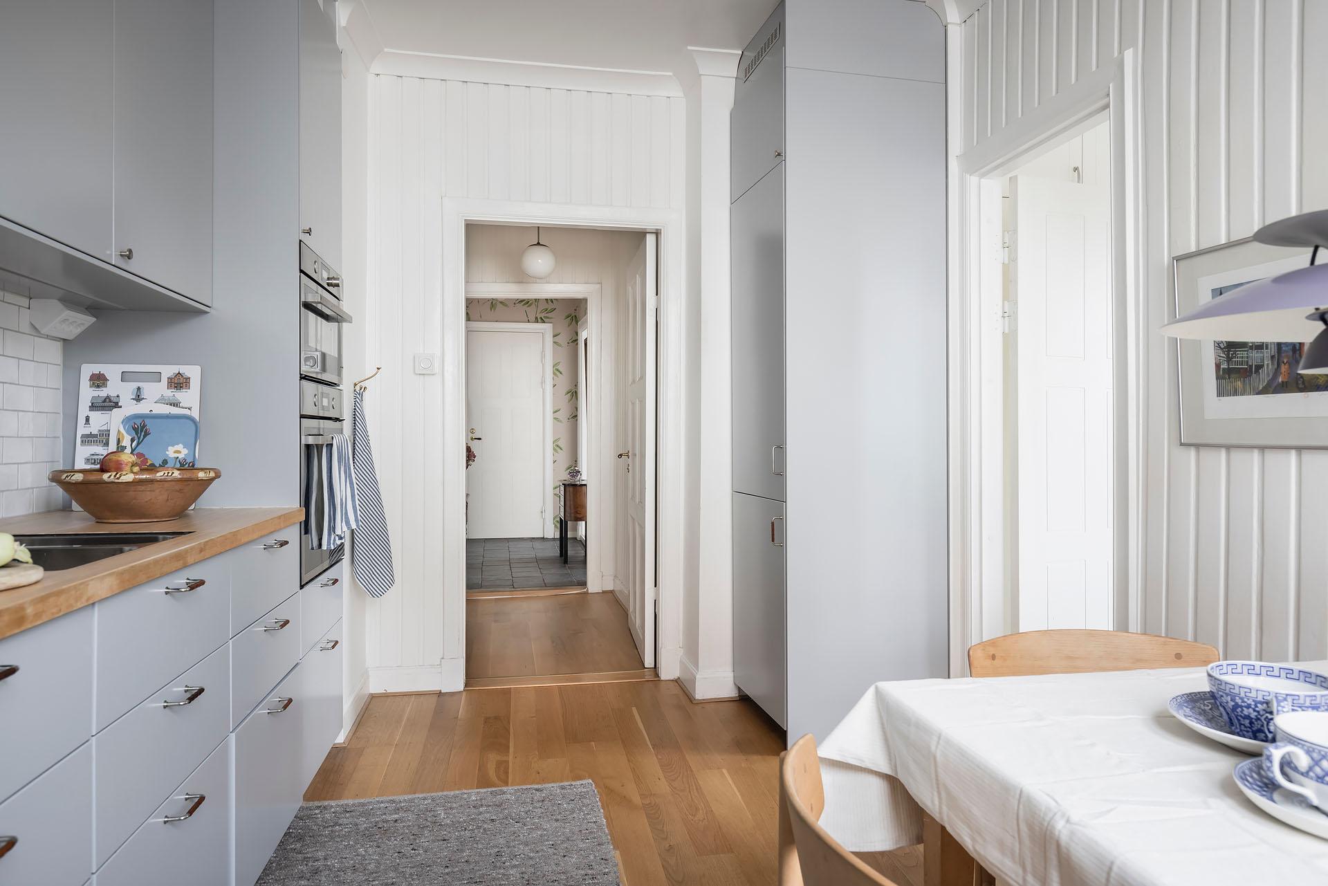Till höger från hallen leder den charmiga serveringsgången med bevarad pärlspont in till köket – en detalj som påminner om husets historia och skapar en genuin atmosfär. Köket totalrenoverades 2021 och har inredning i sobert ljusgrå ton med handtag klädda i läder. Den vitkaklade väggen och bänkskivan i ask ger ett rofyllt intryck, och de integrerade vitvarorna (kyl/frys, ugn, induktionshäll, fläkt (kopplad till självdrag), diskmaskin och mikrovågsugn) från IKEA smälter diskret in i helheten. Här finns plats för ett matbord för fyra personer, och läget mot öster gör frukostkaffet till en solbelyst ritual.