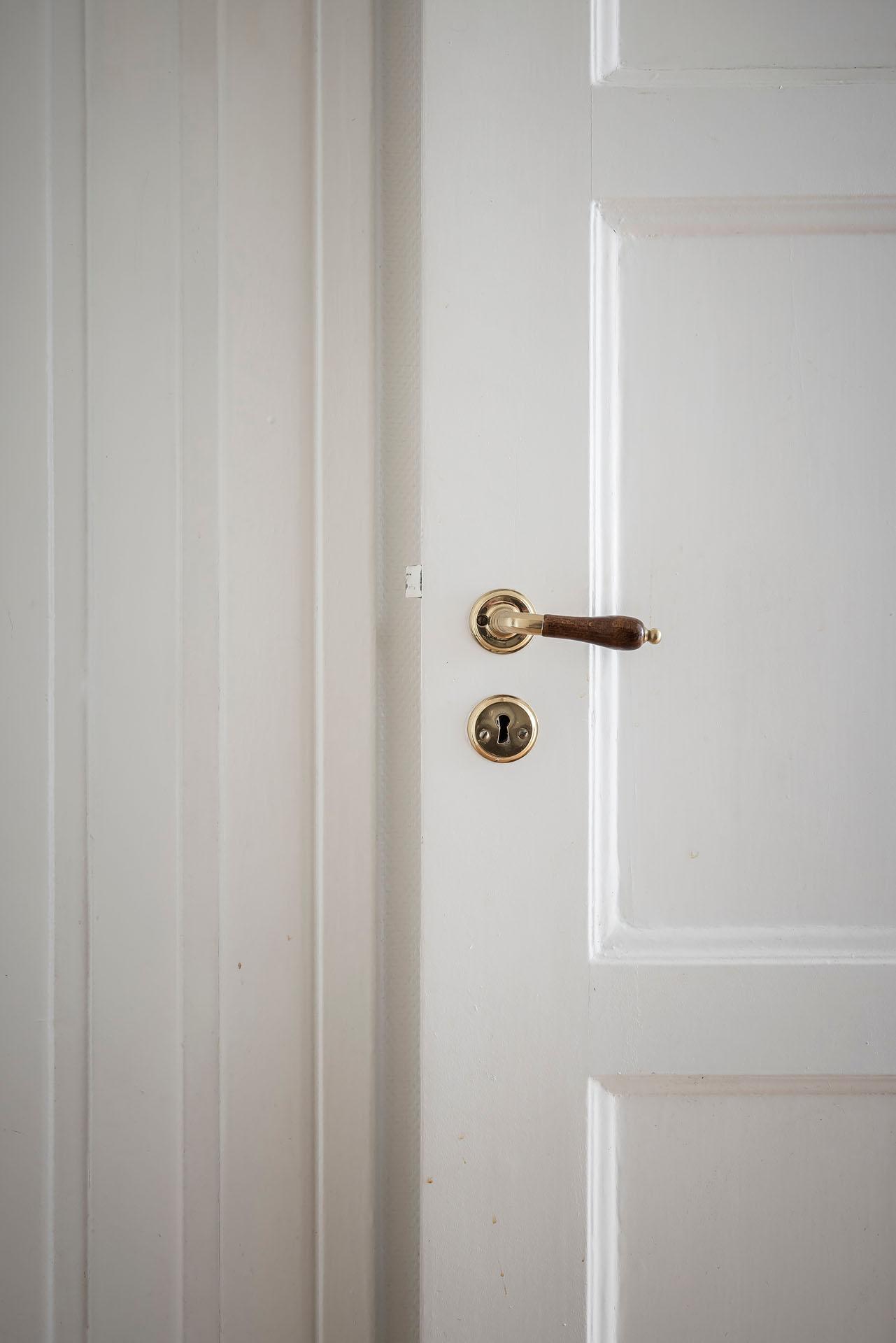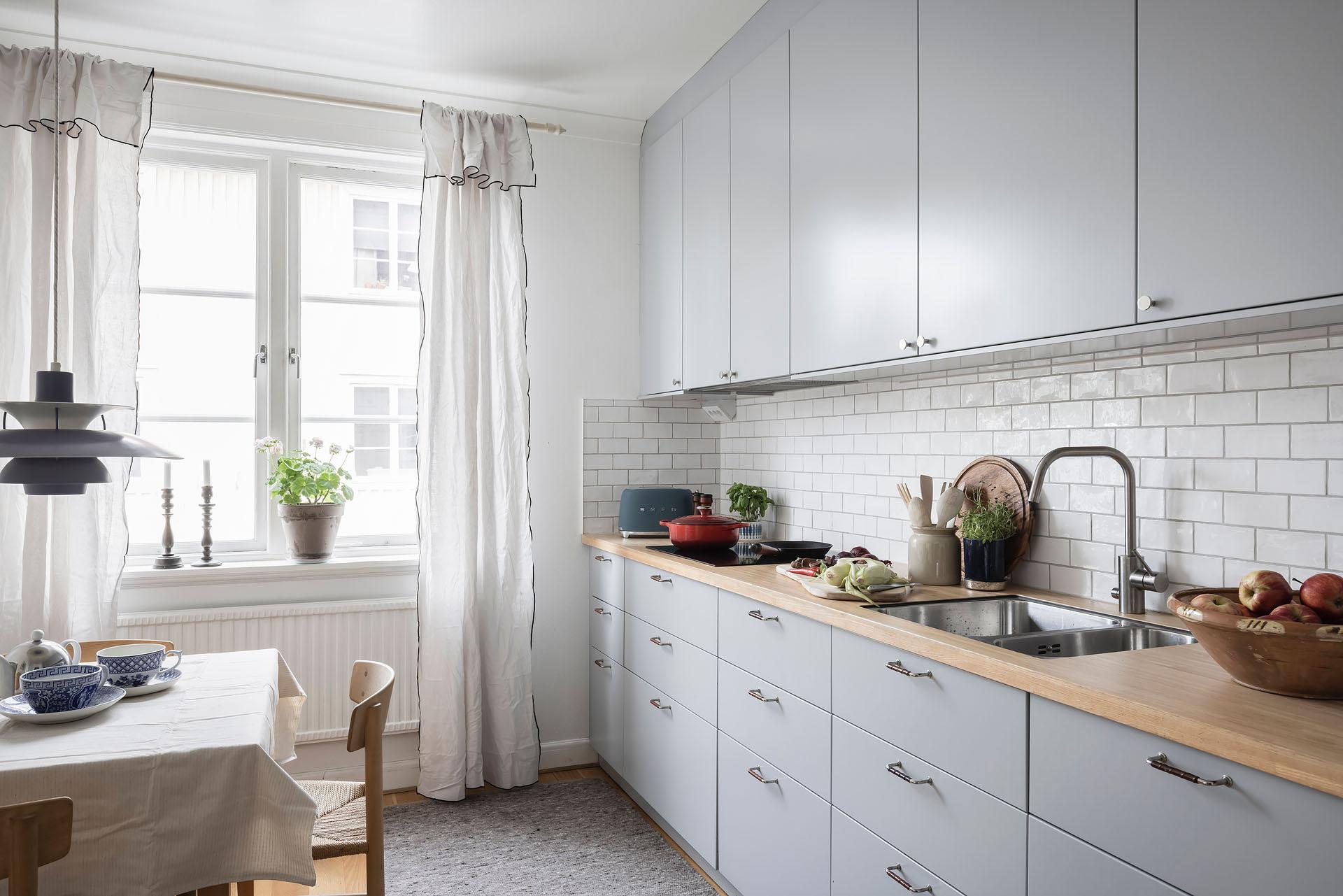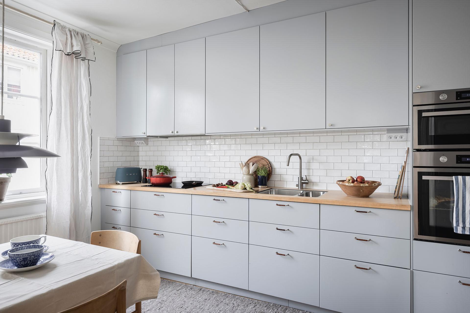 Till höger från hallen leder den charmiga serveringsgången med bevarad pärlspont in till köket – en detalj som påminner om husets historia och skapar en genuin atmosfär. Köket totalrenoverades 2021 och har inredning i sobert ljusgrå ton med handtag klädda i läder. Den vitkaklade väggen och bänkskivan i ask ger ett rofyllt intryck, och de integrerade vitvarorna (kyl/frys, ugn, induktionshäll, fläkt (kopplad till självdrag), diskmaskin och mikrovågsugn) från IKEA smälter diskret in i helheten. Här finns plats för ett matbord för fyra personer, och läget mot öster gör frukostkaffet till en solbelyst ritual.
