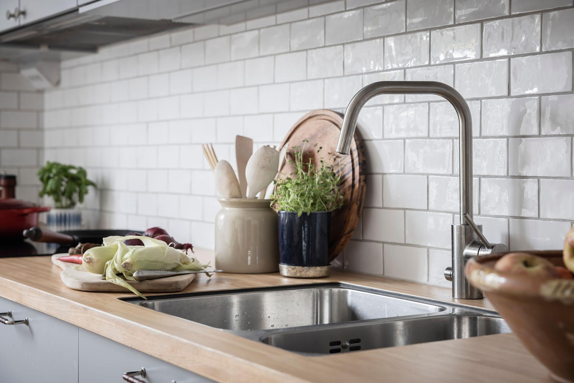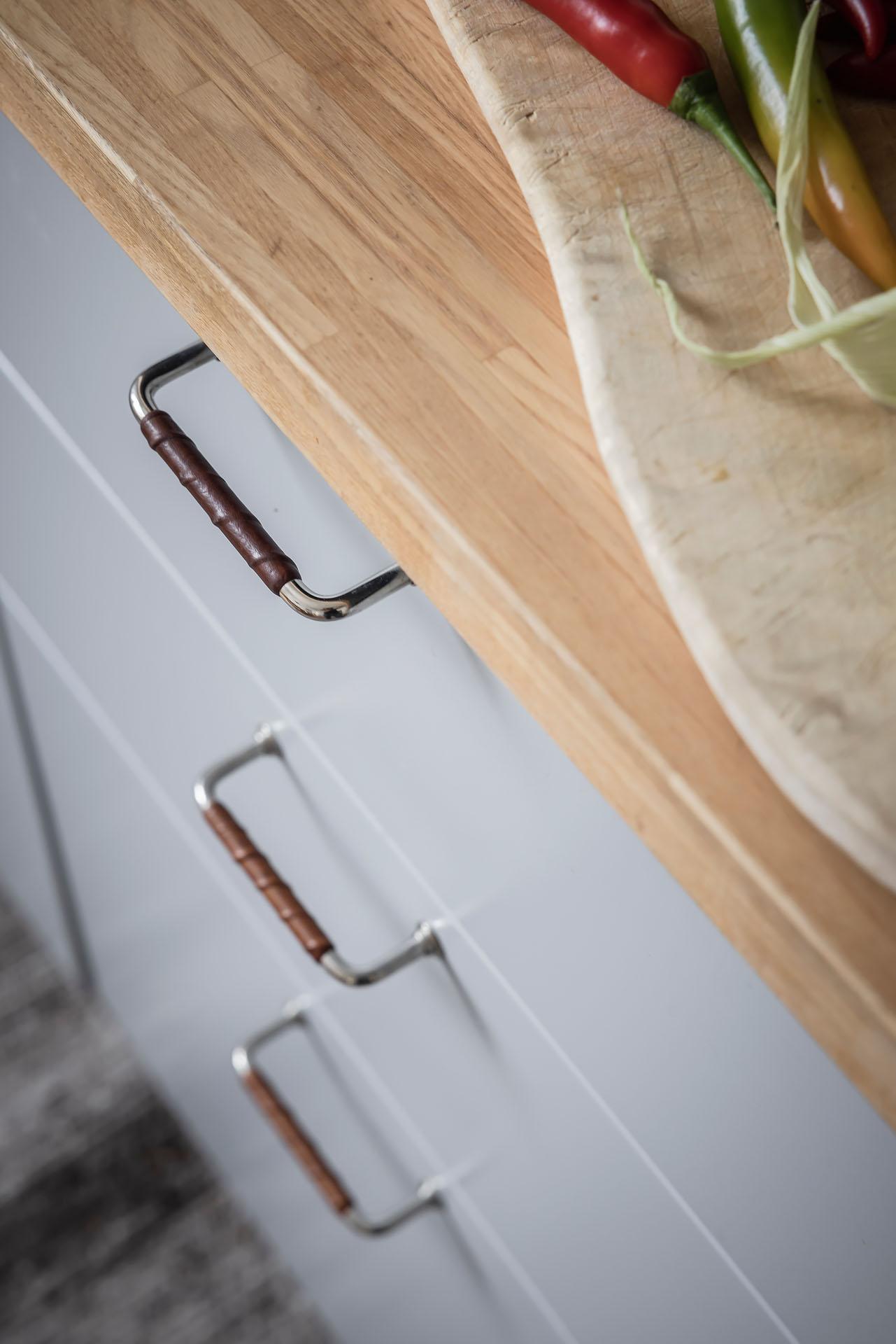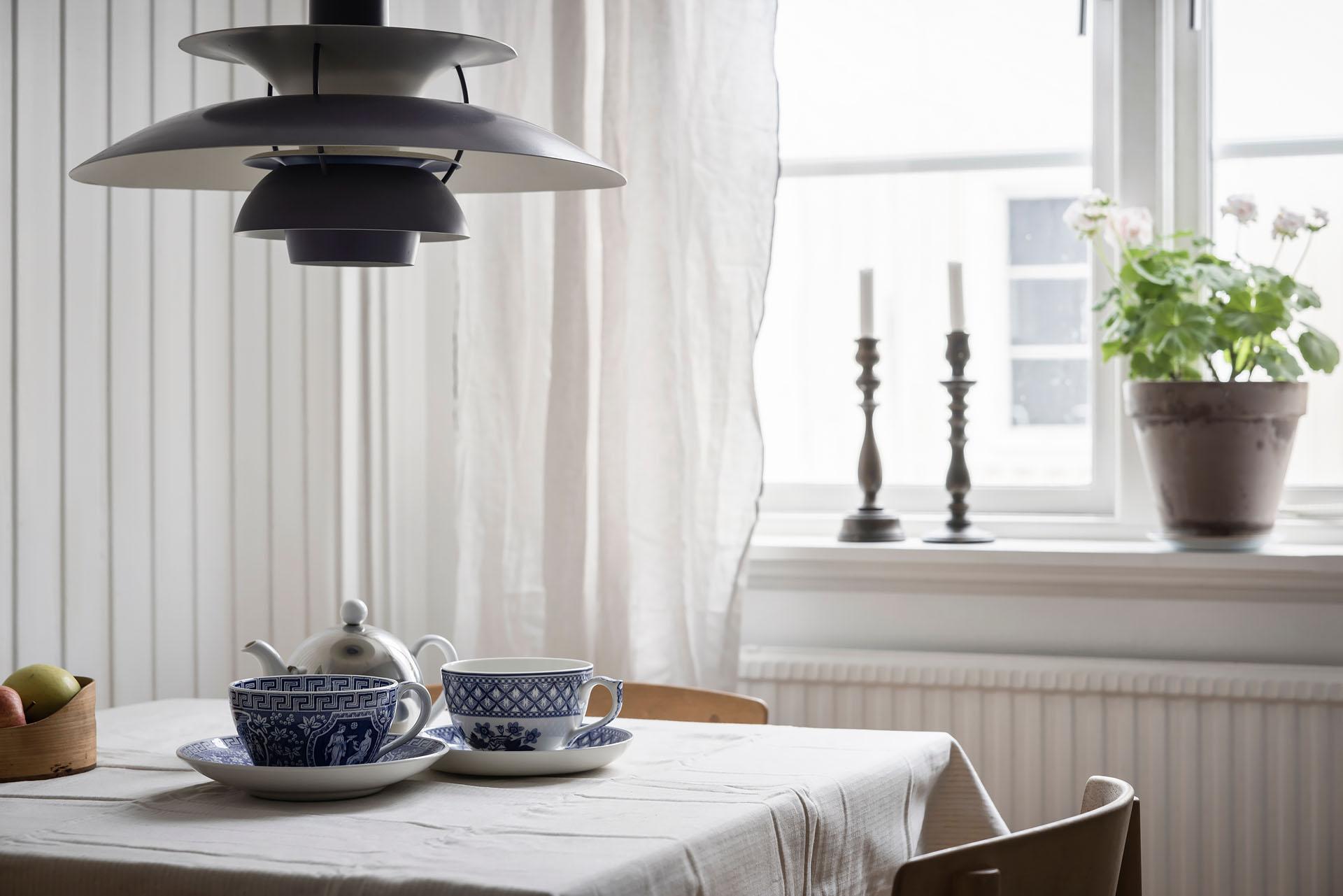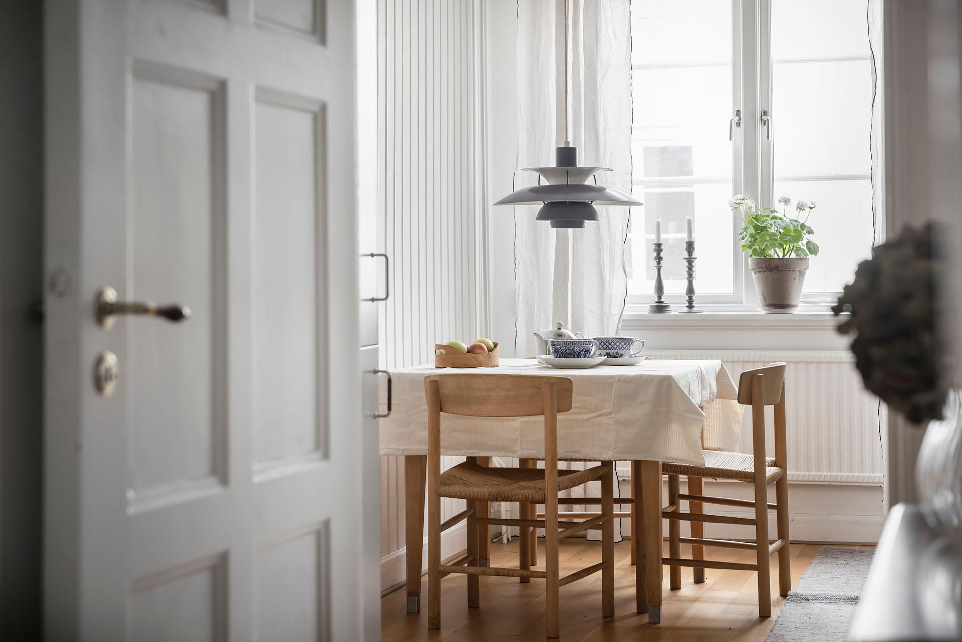 Till höger från hallen leder den charmiga serveringsgången med bevarad pärlspont in till köket – en detalj som påminner om husets historia och skapar en genuin atmosfär. Köket totalrenoverades 2021 och har inredning i sobert ljusgrå ton med handtag klädda i läder. Den vitkaklade väggen och bänkskivan i ask ger ett rofyllt intryck, och de integrerade vitvarorna (kyl/frys, ugn, induktionshäll, fläkt (kopplad till självdrag), diskmaskin och mikrovågsugn) från IKEA smälter diskret in i helheten. Här finns plats för ett matbord för fyra personer, och läget mot öster gör frukostkaffet till en solbelyst ritual.