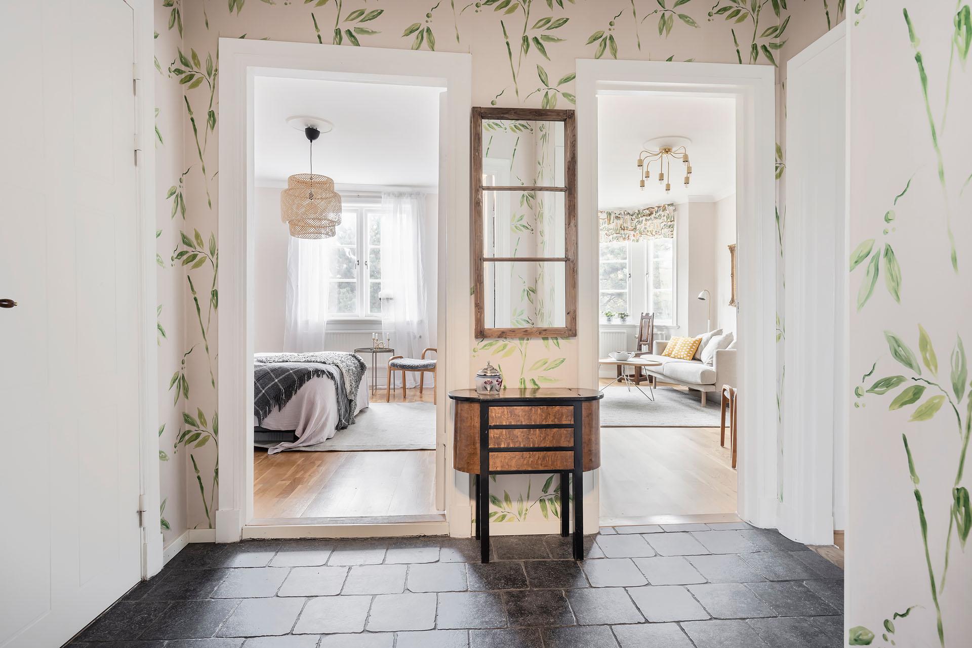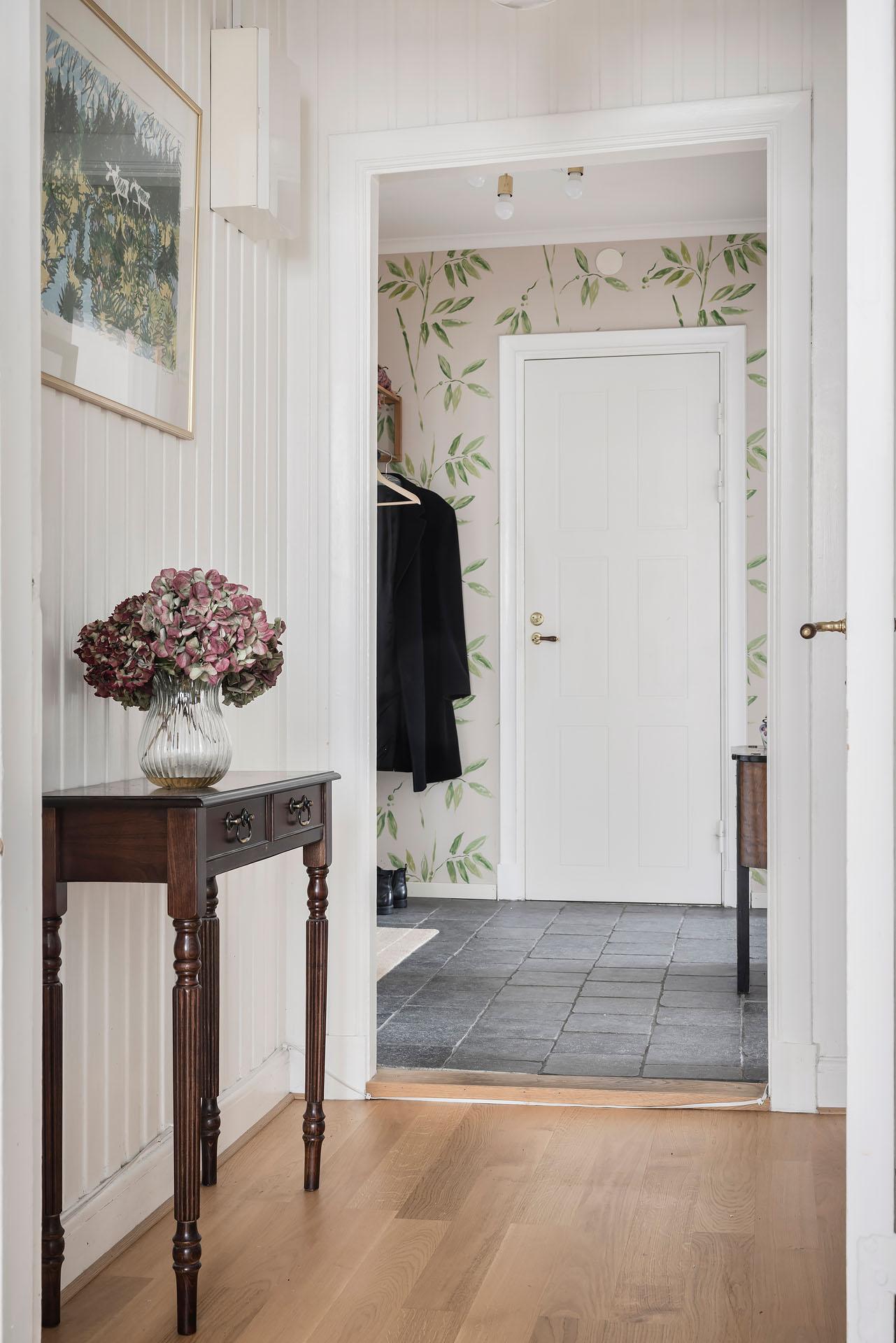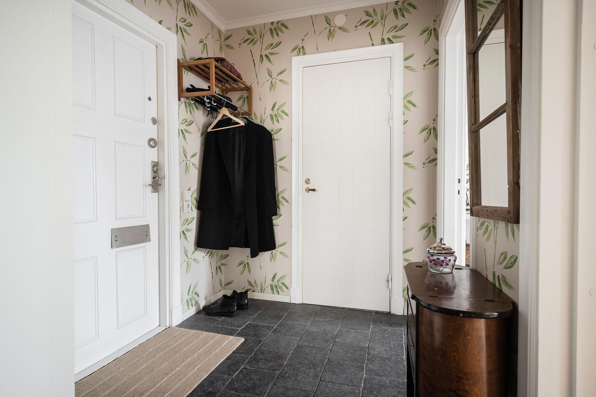 Entrén välkomnar med gott om utrymme för både klädförvaring och städskåp. Här möts du av ett tåligt golv i grå granitkeramik och en krämfärgad tapet från Designers Guild med gröna bladmotiv.