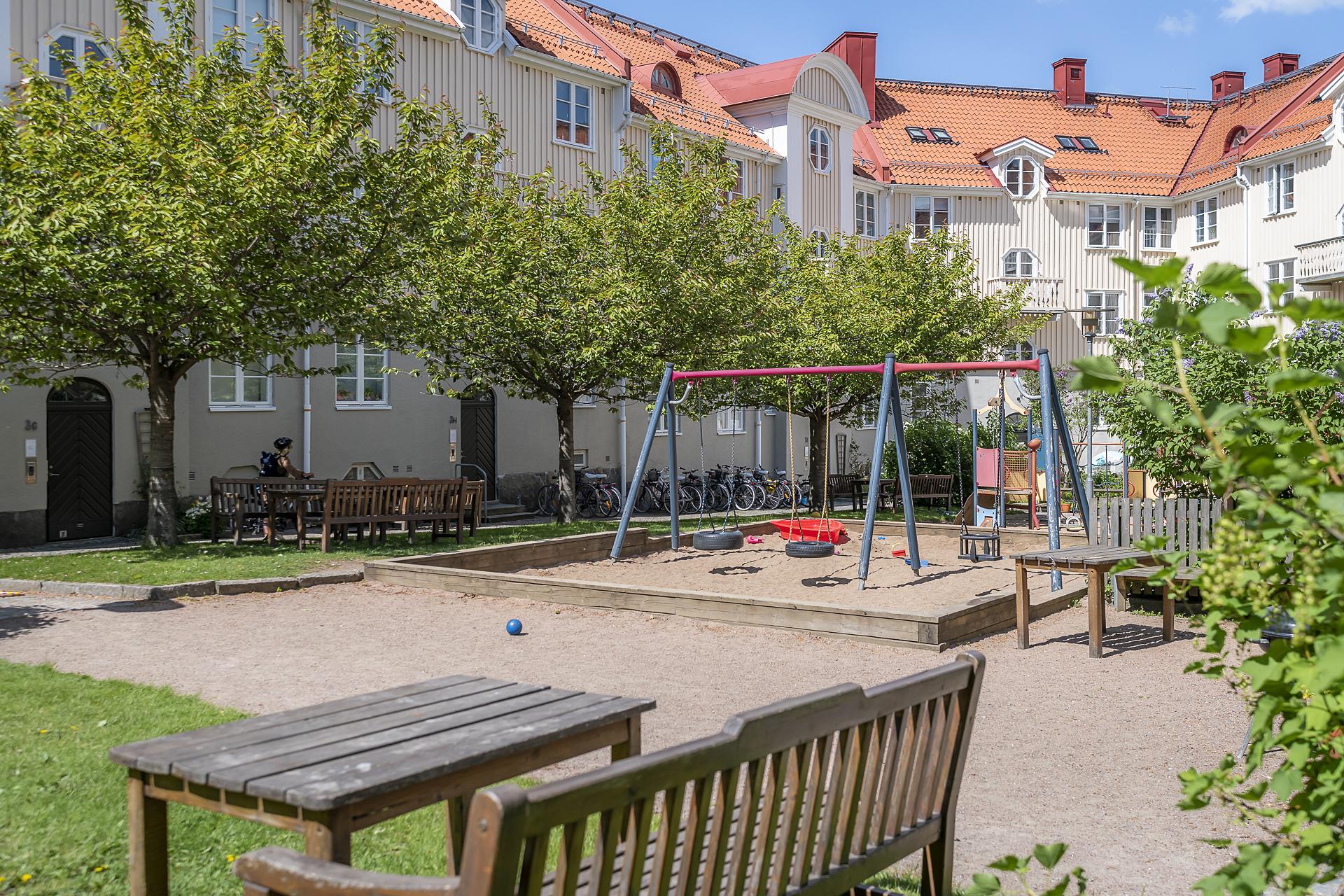 - Balkong/Uteplats: Ja. Gemensam innergård med träd, buskar, lekplats och uteplatser.