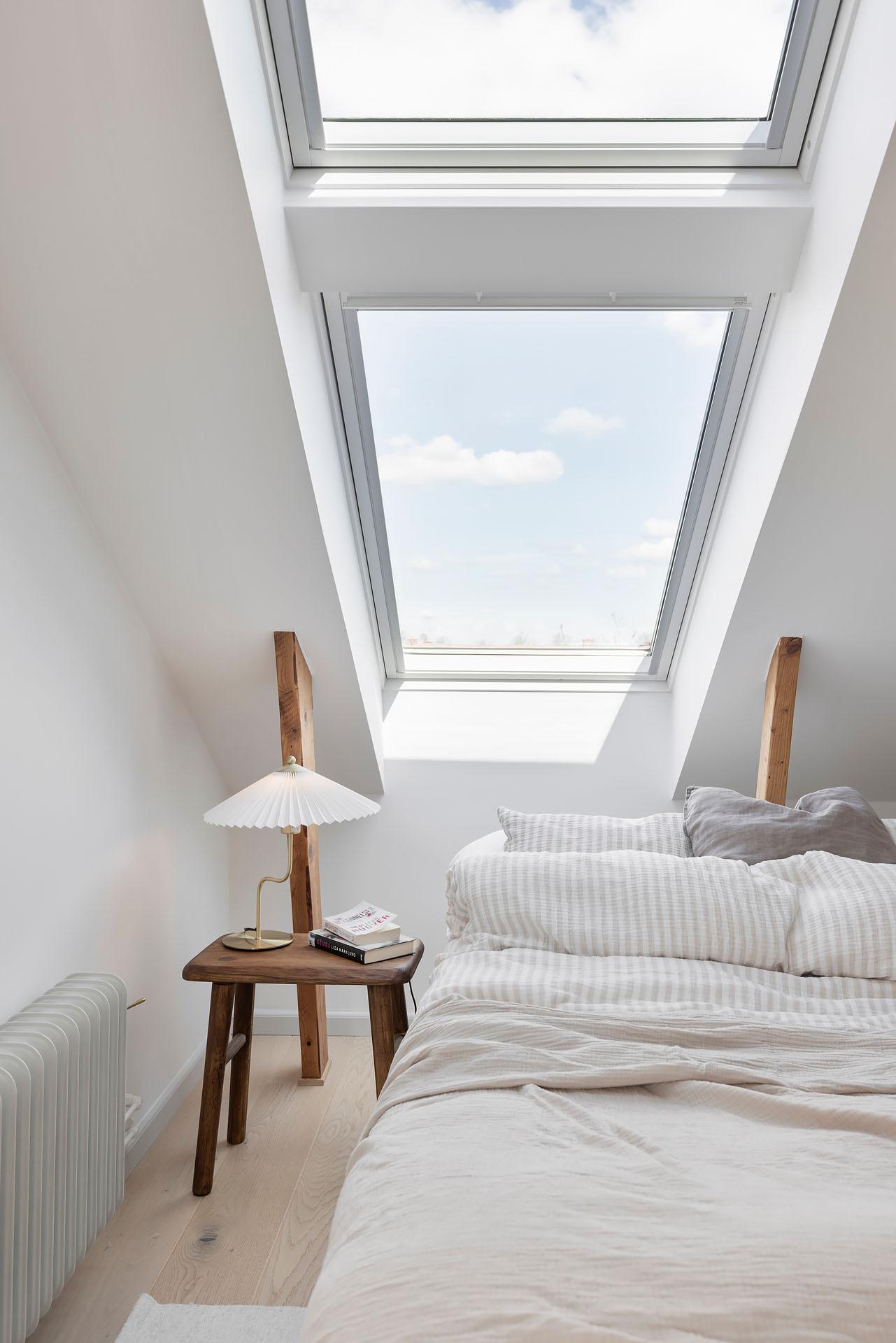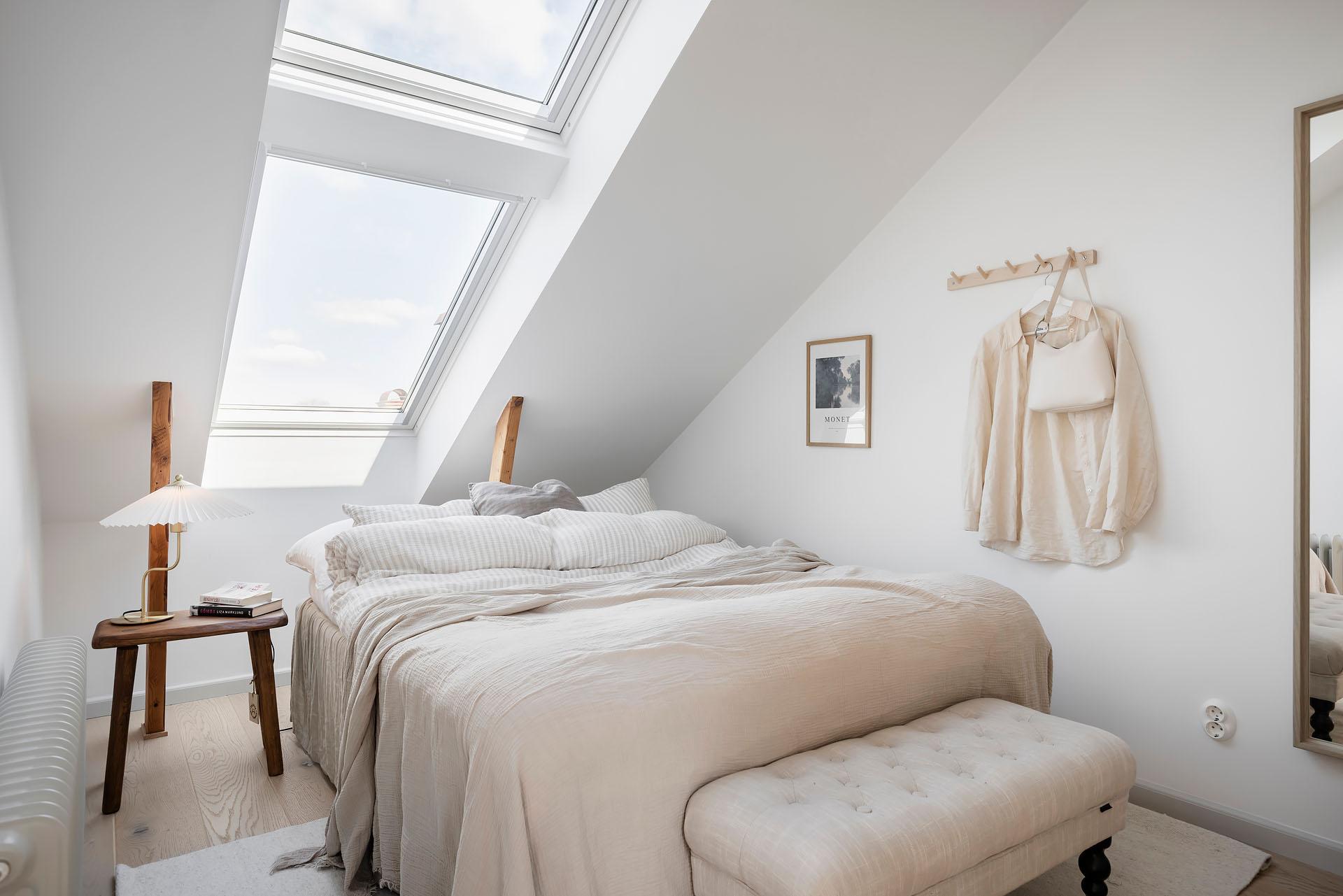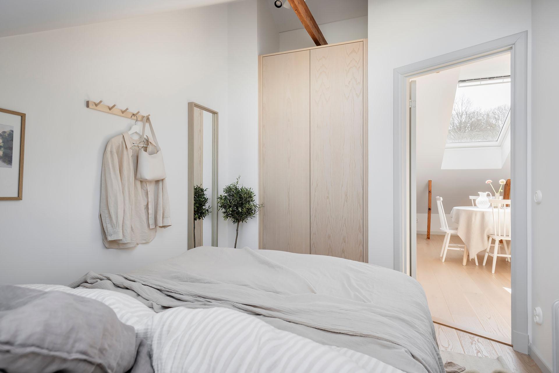 Sovrummet har plats för en dubbelsäng, och bra förvaringsmöjligheter finns i form av en rymlig dubbelgarderob i ask från Nordiska Kök. Här somnar man till stjärnhimlen utanför takfönstret, och på morgonen är det underbart att vakna till utsikten över takåsarna och himlen.