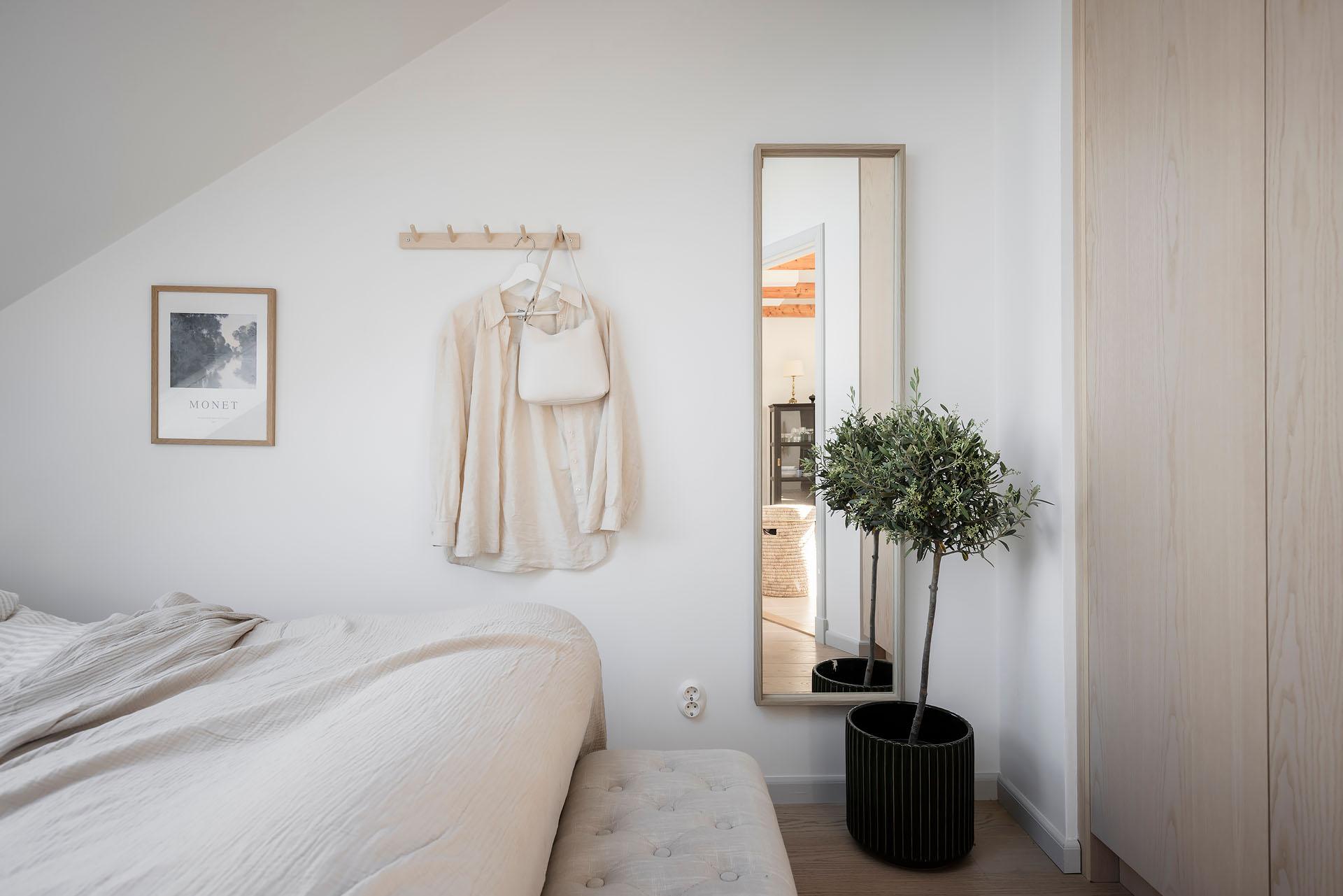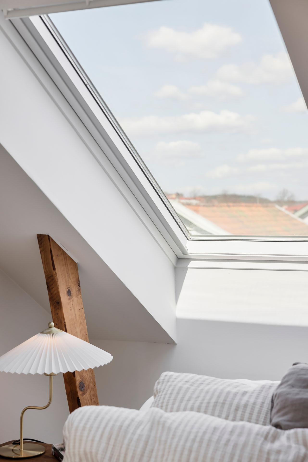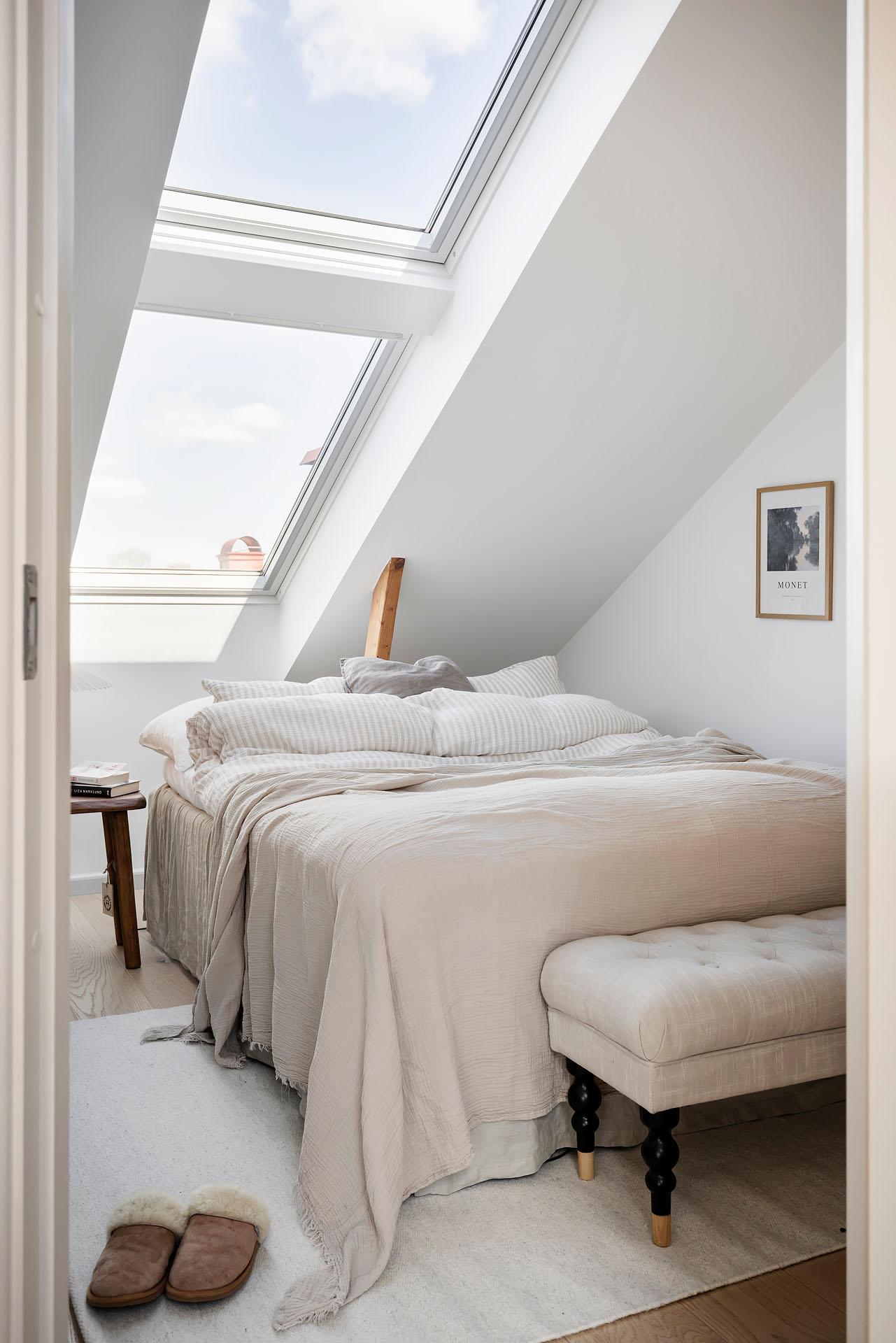 Sovrummet har plats för en dubbelsäng, och bra förvaringsmöjligheter finns i form av en rymlig dubbelgarderob i ask från Nordiska Kök. Här somnar man till stjärnhimlen utanför takfönstret, och på morgonen är det underbart att vakna till utsikten över takåsarna och himlen.