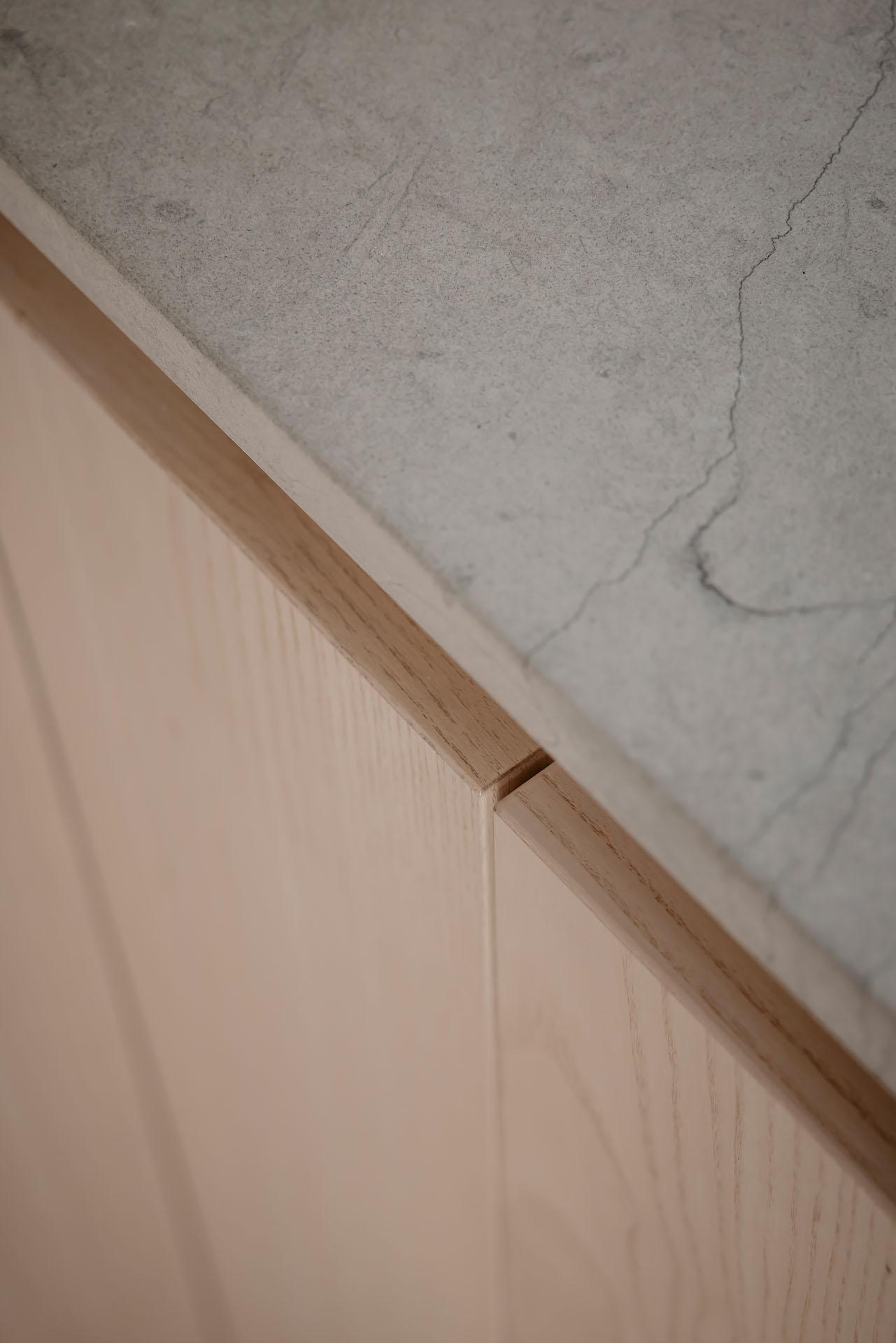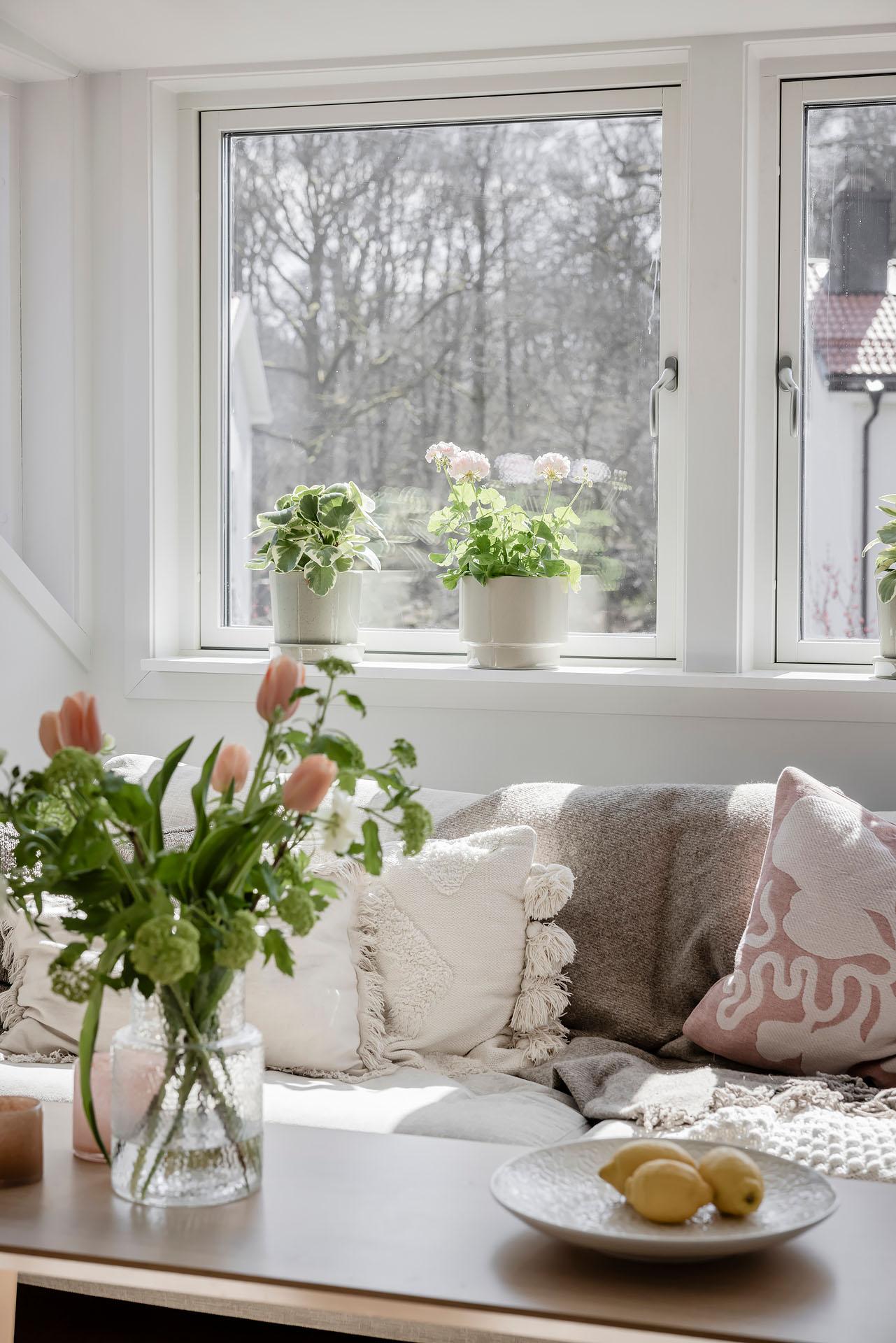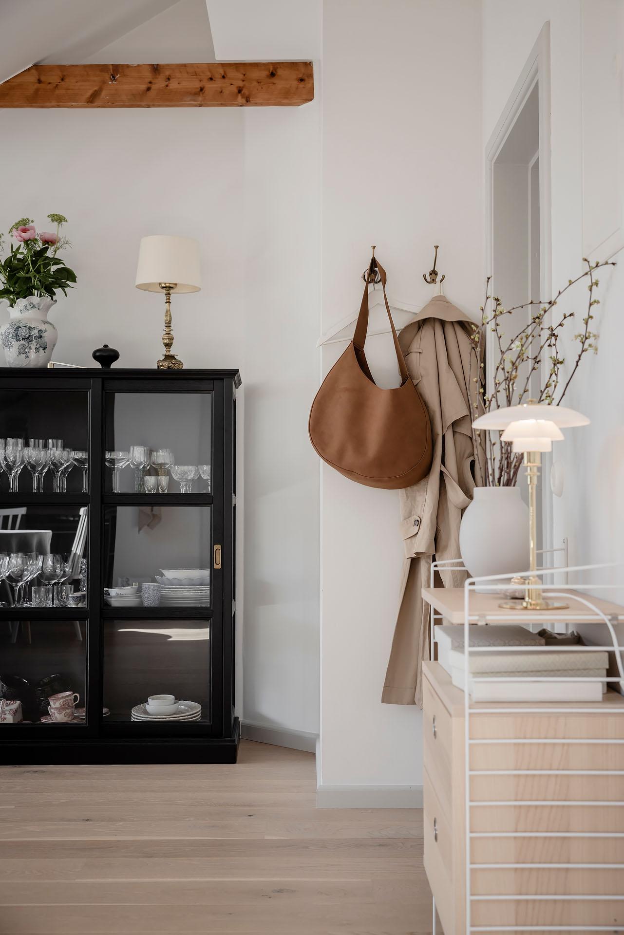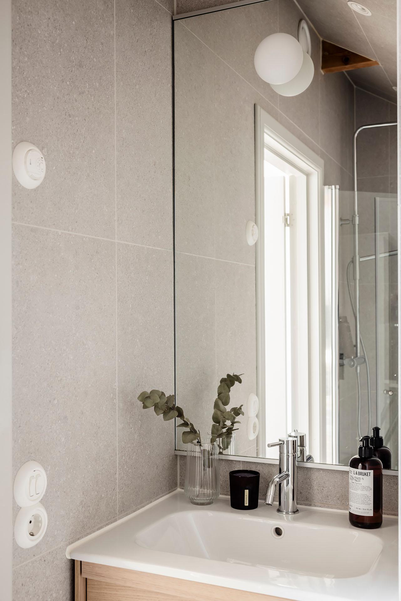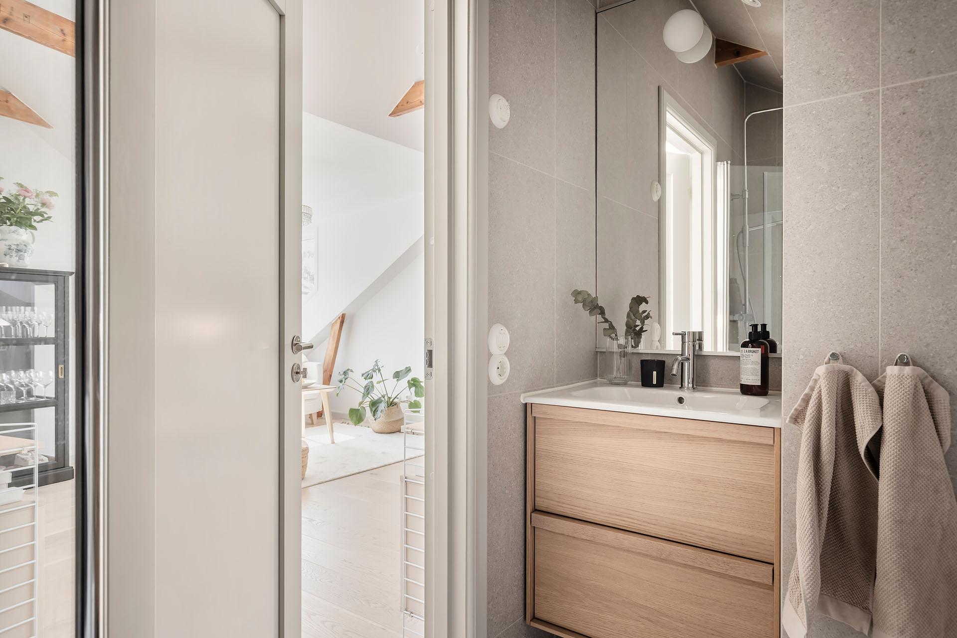 Det är verkligen en lägenhet som det är lätt att tycka om, och de spännande vinklarna, snedtaket och de synliga takbjälkarna ger den en unik känsla. Det är öppet upp till nock, och som högst är takhöjden om över tre meter. Alla material – ask, kalksten, granitkeramik med mera – är valda med omsorg och andas såväl smakfullhet som harmoni. Ljusinsläppet är något utöver det vanliga, och den lummiga grönskan utanför de många fönstren känns rogivande. Fönster i motsatta väderstreck gör att man kan vädra ut och skapa behaglig svalka på sommaren. Takbelysningen är dimbar, och Plejd möjliggör smidig styrning och skapande av olika scenarier från mobilen. De snygga strömbrytarna och eluttagen kommer från Renova, och de fina elementen från Lenhovda Radiatorfabrik.