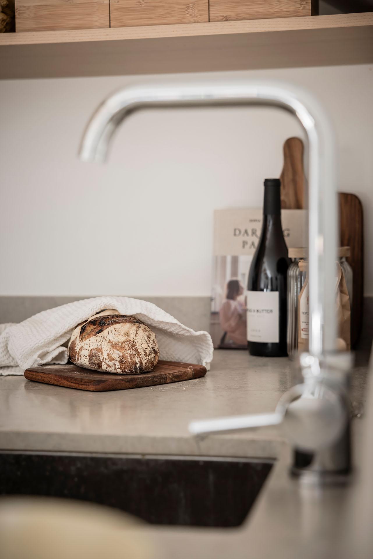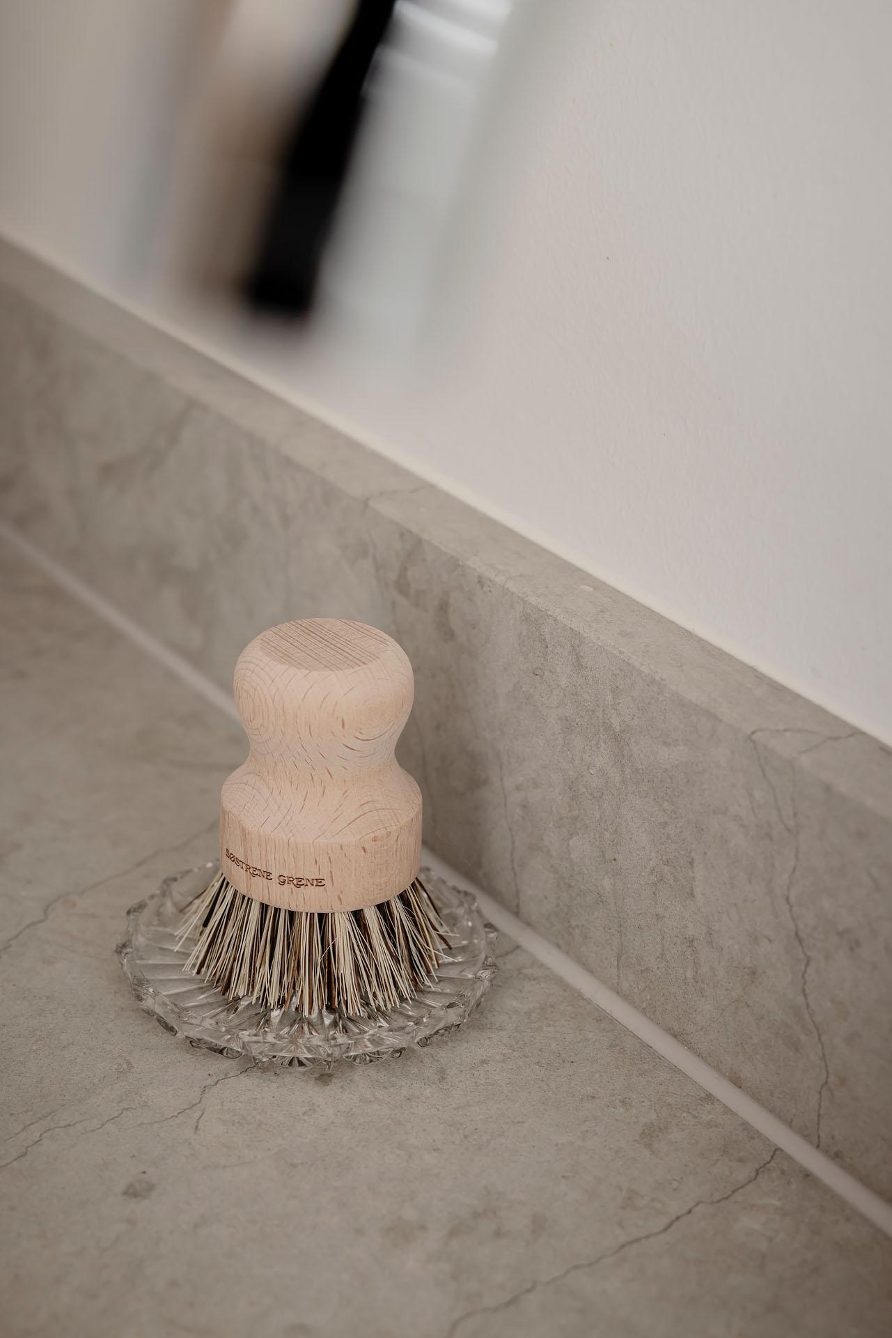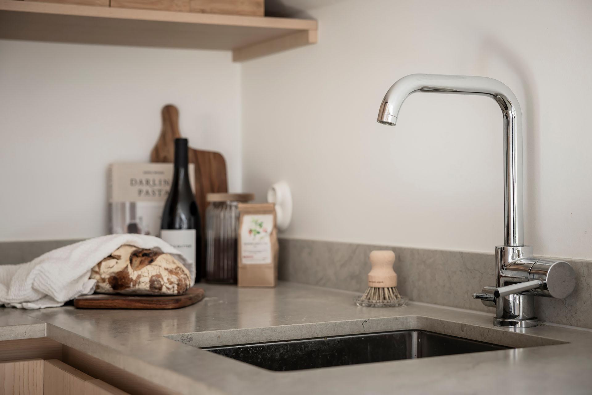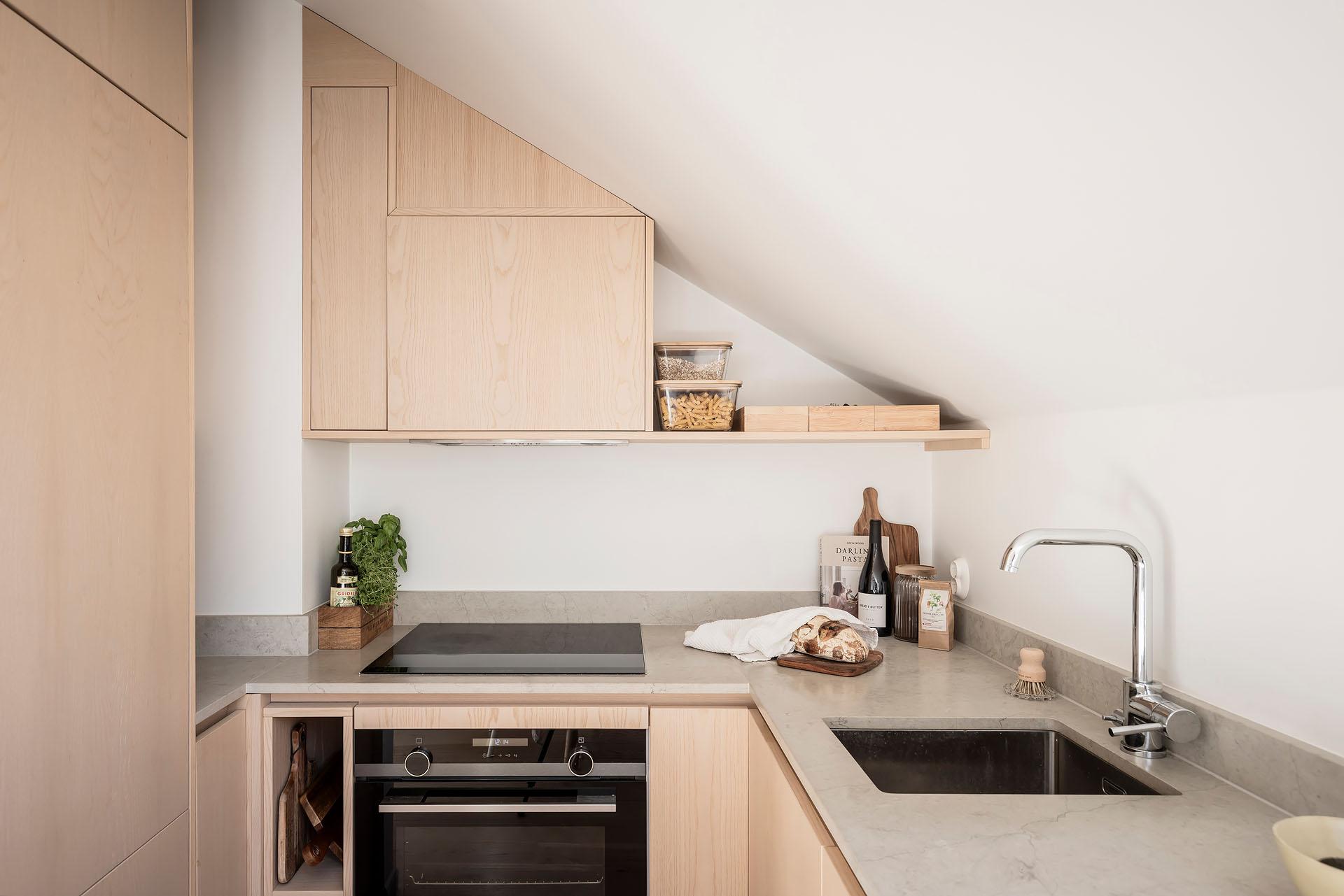 Köket är lika välplanerat som smakfullt, och det finns gott om arbetsyta. Bänkarna är i kalksten med infälld spishäll och diskho. Inredningen kommer från Nordiska Kök, och de gedigna skåpen har tidlösa luckor och lådor i ask. Den inbyggda ugnen är svart medan fläkten, diskmaskinen och kylen/frysen är integrerade i inredningen. Alla vitvaror är av märket Siemens. Extra förvaring finns i kattvinden bredvid.