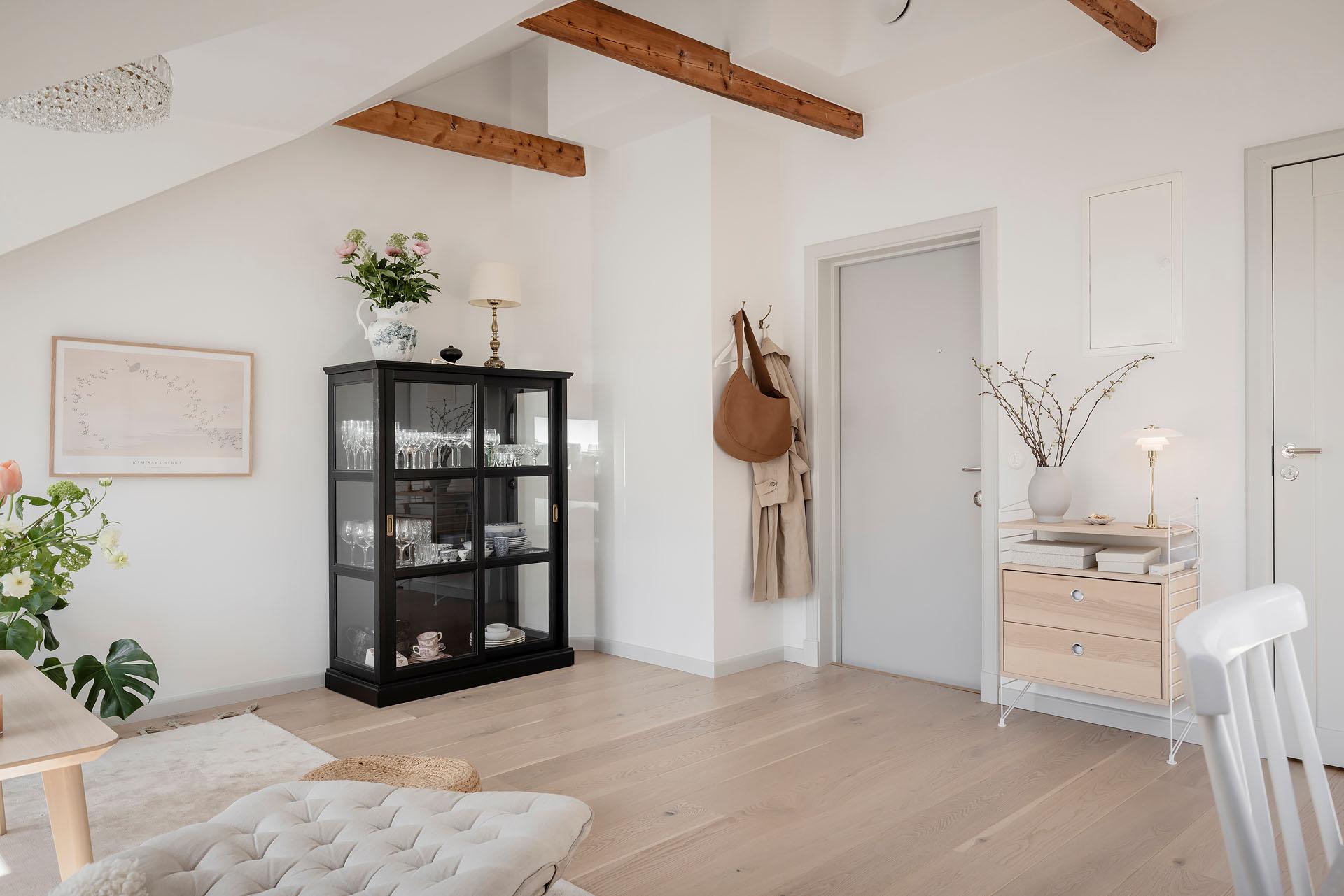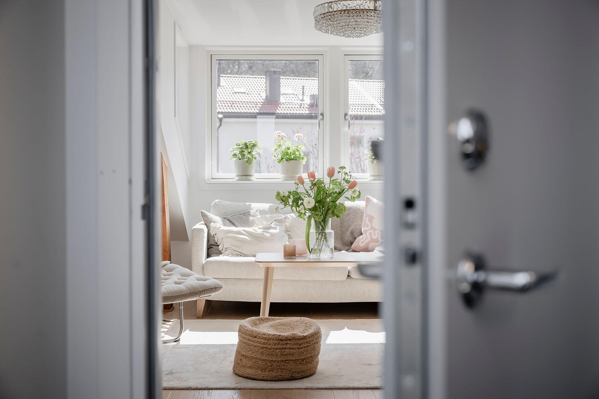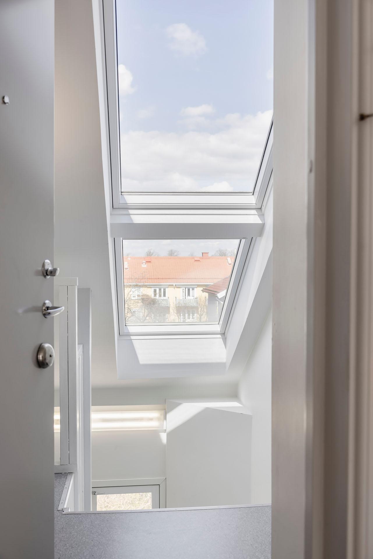 En trappa med härligt ljusinsläpp från två takfönster leder upp till lägenhetens entré som öppnar sig mot vardagsrummet och köket. Innanför ytterdörren finns det utrymme för jackavhängning.