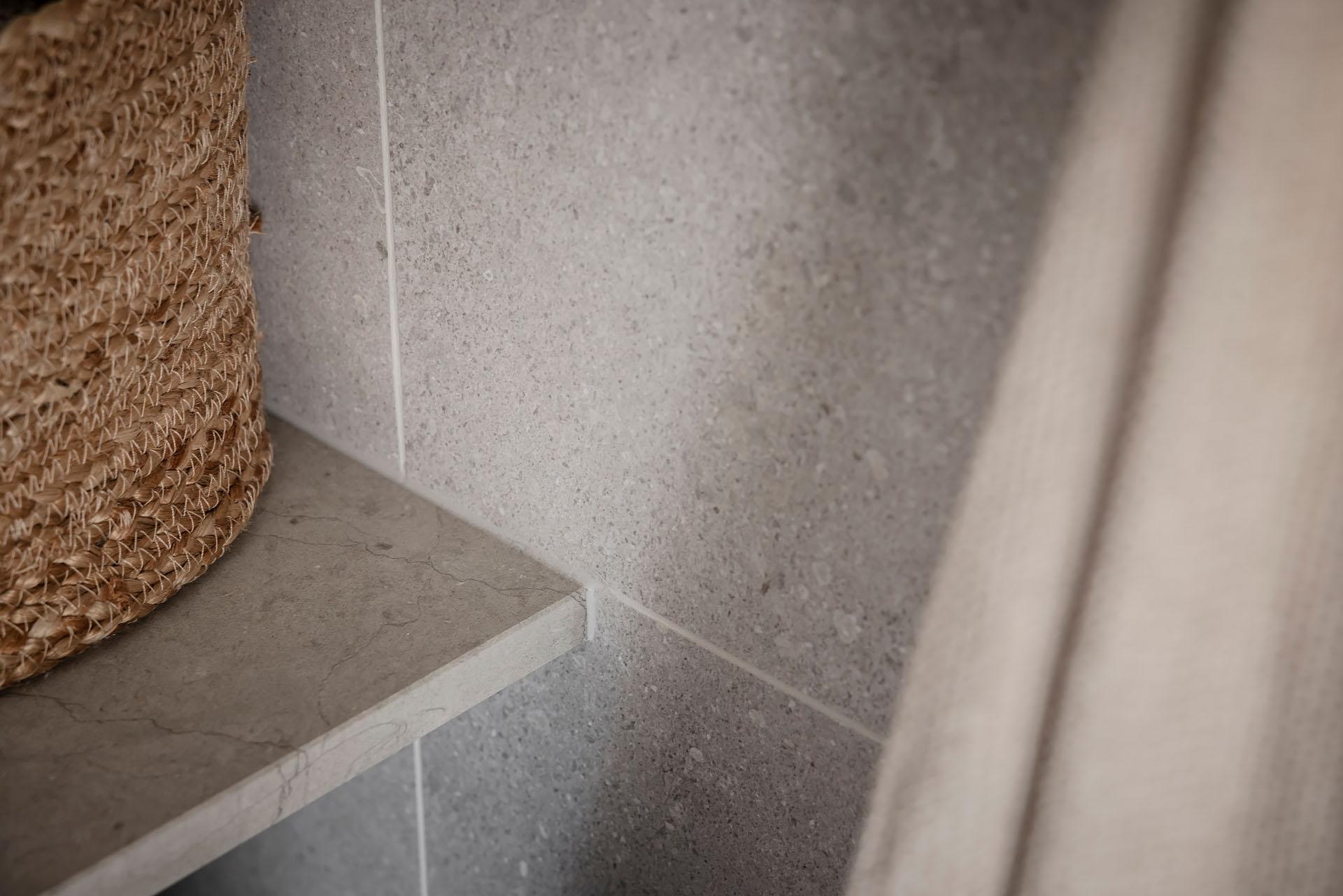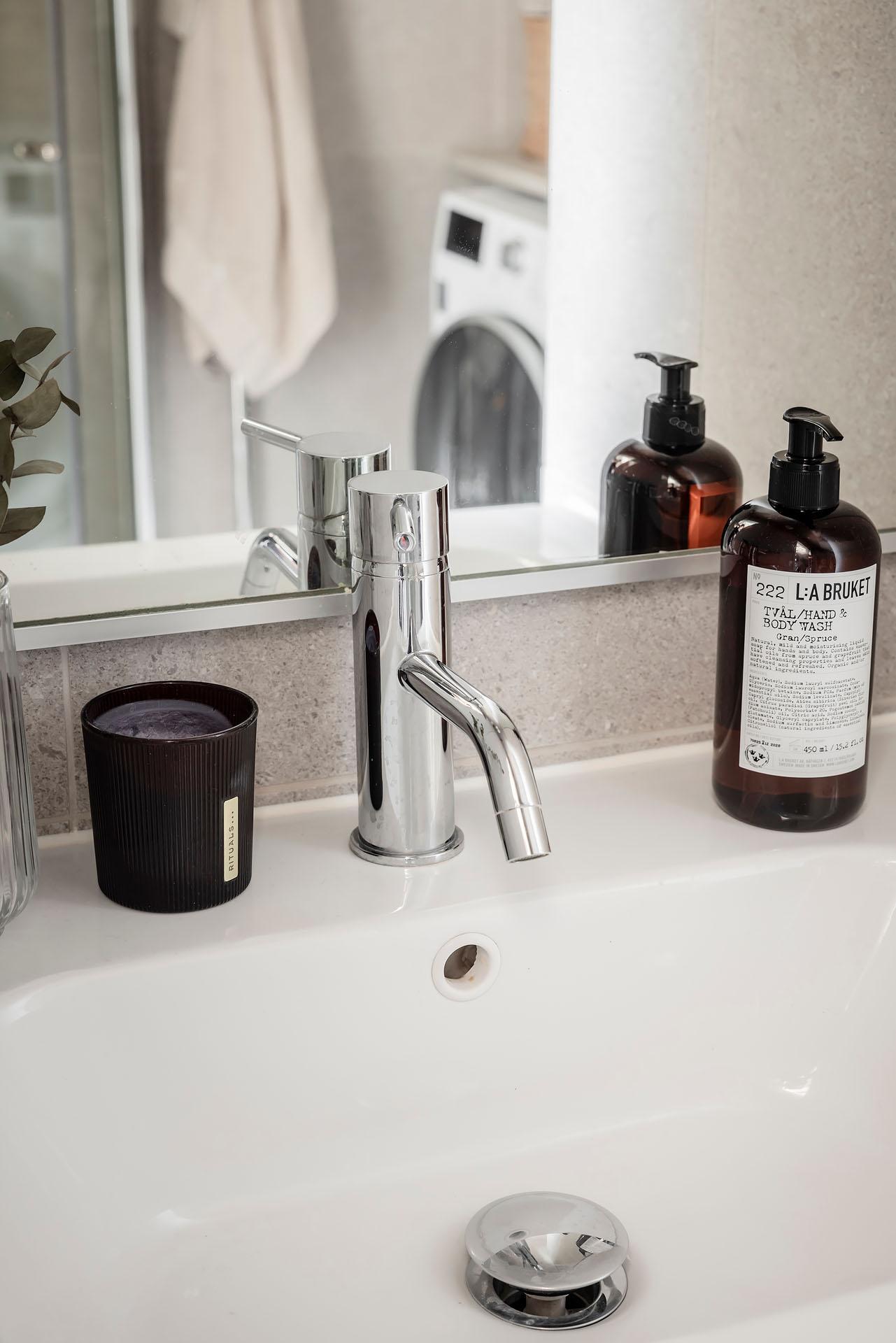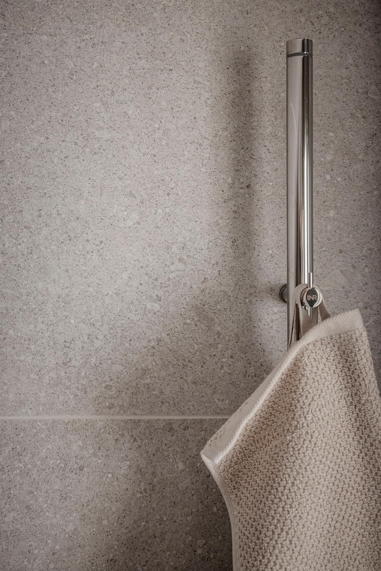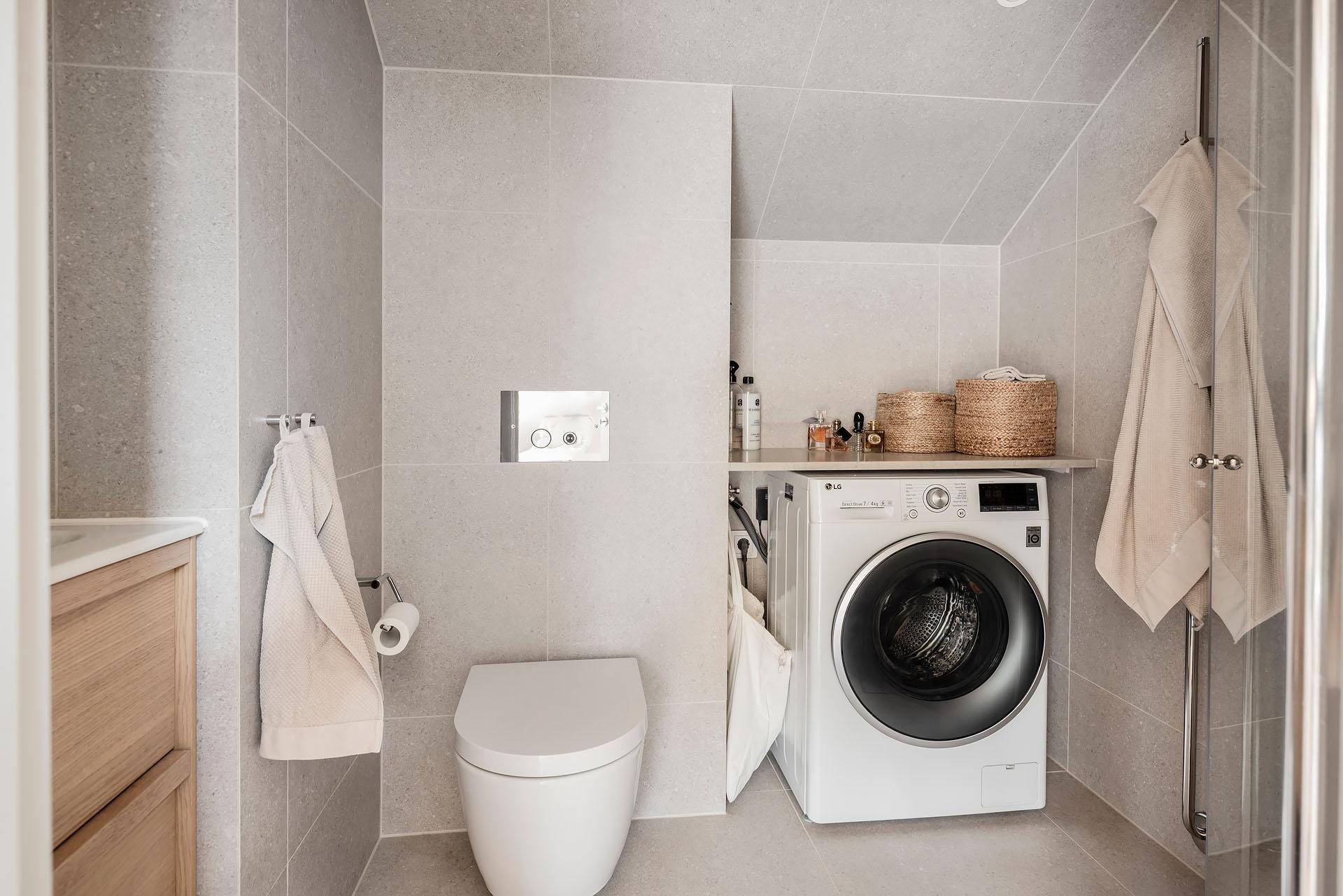 Väggkakel och golvklinker i granitkeramik från Bricmate ger lägenhetens badrum en lika harmonisk som lyxig känsla. Här finns utöver duschhörna, handdukstork, tvättkommod, golvvärme och vägghängd toalett även en kombinerad tvättmaskin och torktumlare under en praktisk arbetsbänk. Kommoden kommer från Haven och tvättmaskinen från LG. Duschhörnan, som skärmas av med infällbara glasdörrar, är utrustad med både takdusch och handmunstycke.