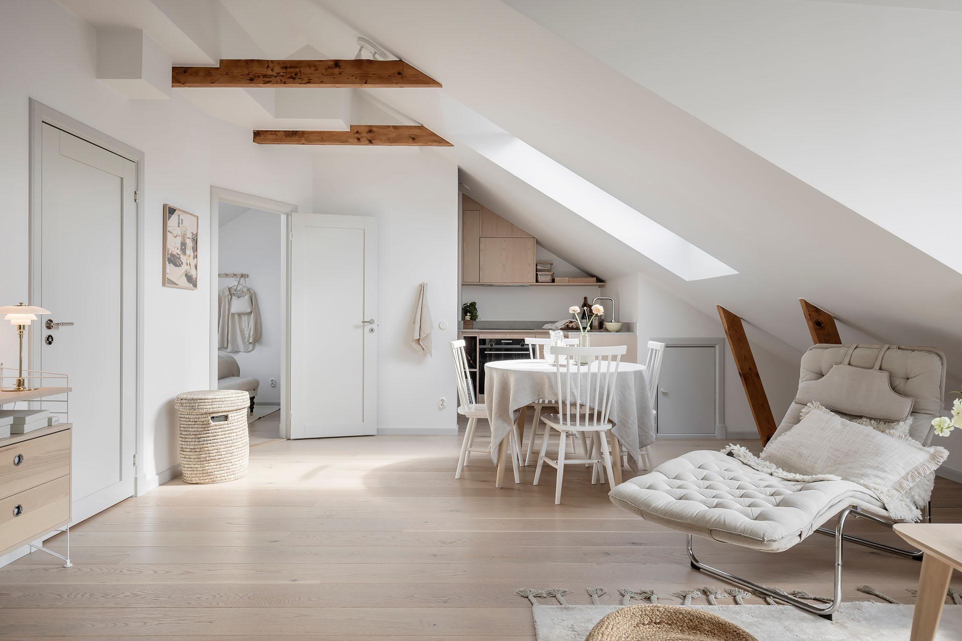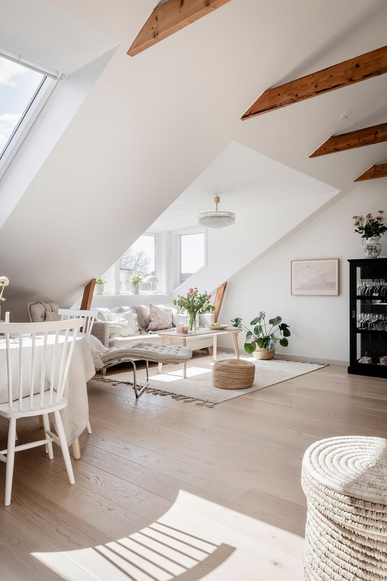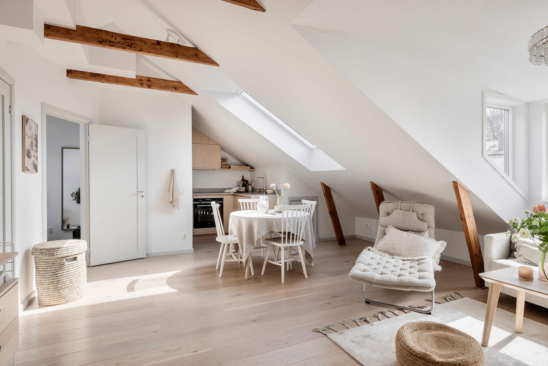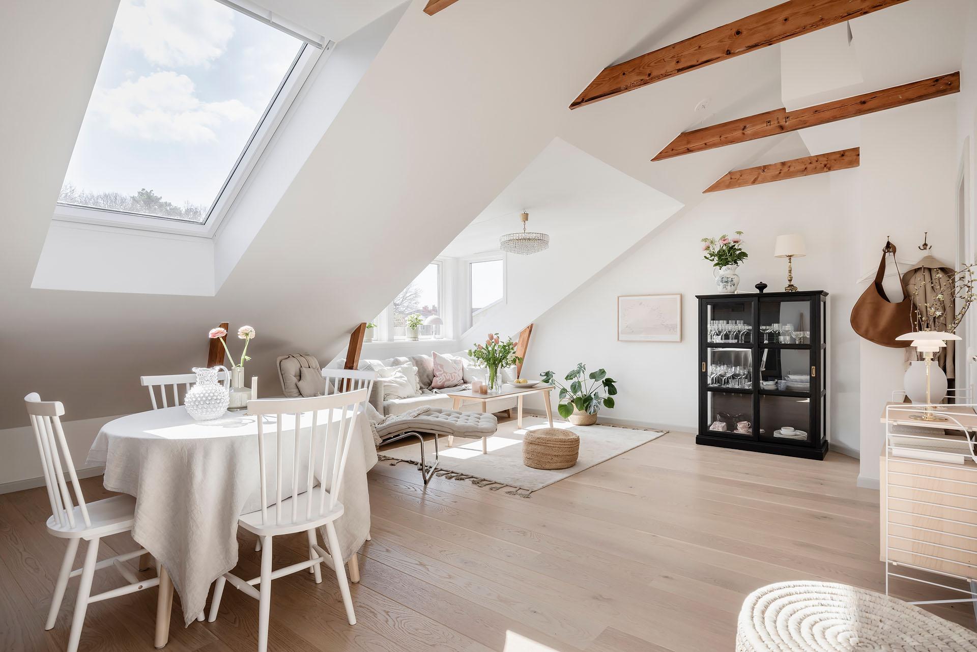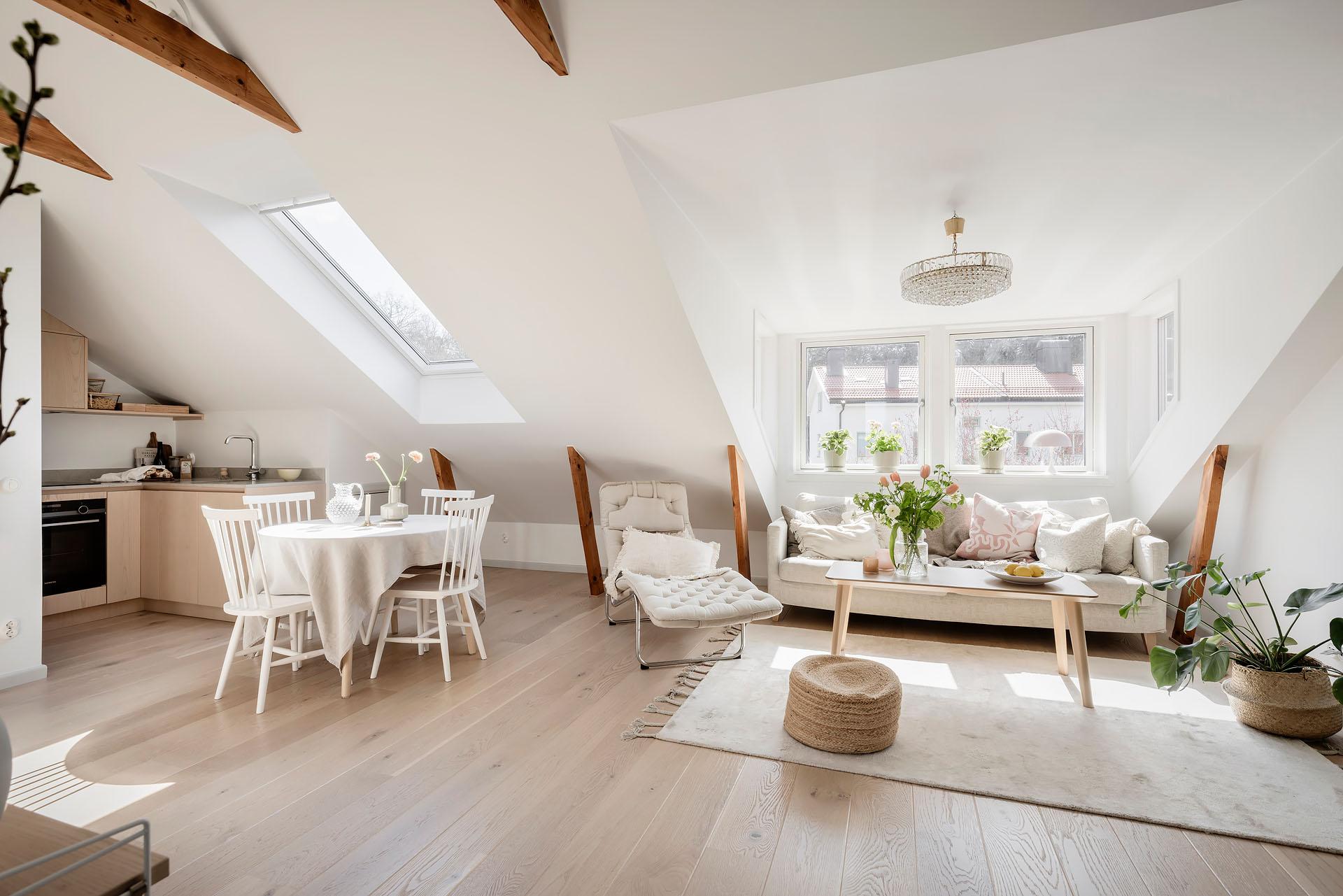 Den öppna planlösningen mellan vardagsrummet och köket bjuder in till umgänge, och det finns utrymme för att samla kompisgänget för trevliga middagar. Intill den fantastiska takkupan med fyra fönster i tre olika väderstreck har soffan sin givna plats. Liksom i övriga lägenheten är väggarna vitmålade och golvet belagt med enstavsparkett i vitpigmenterad ek från Tarkett.