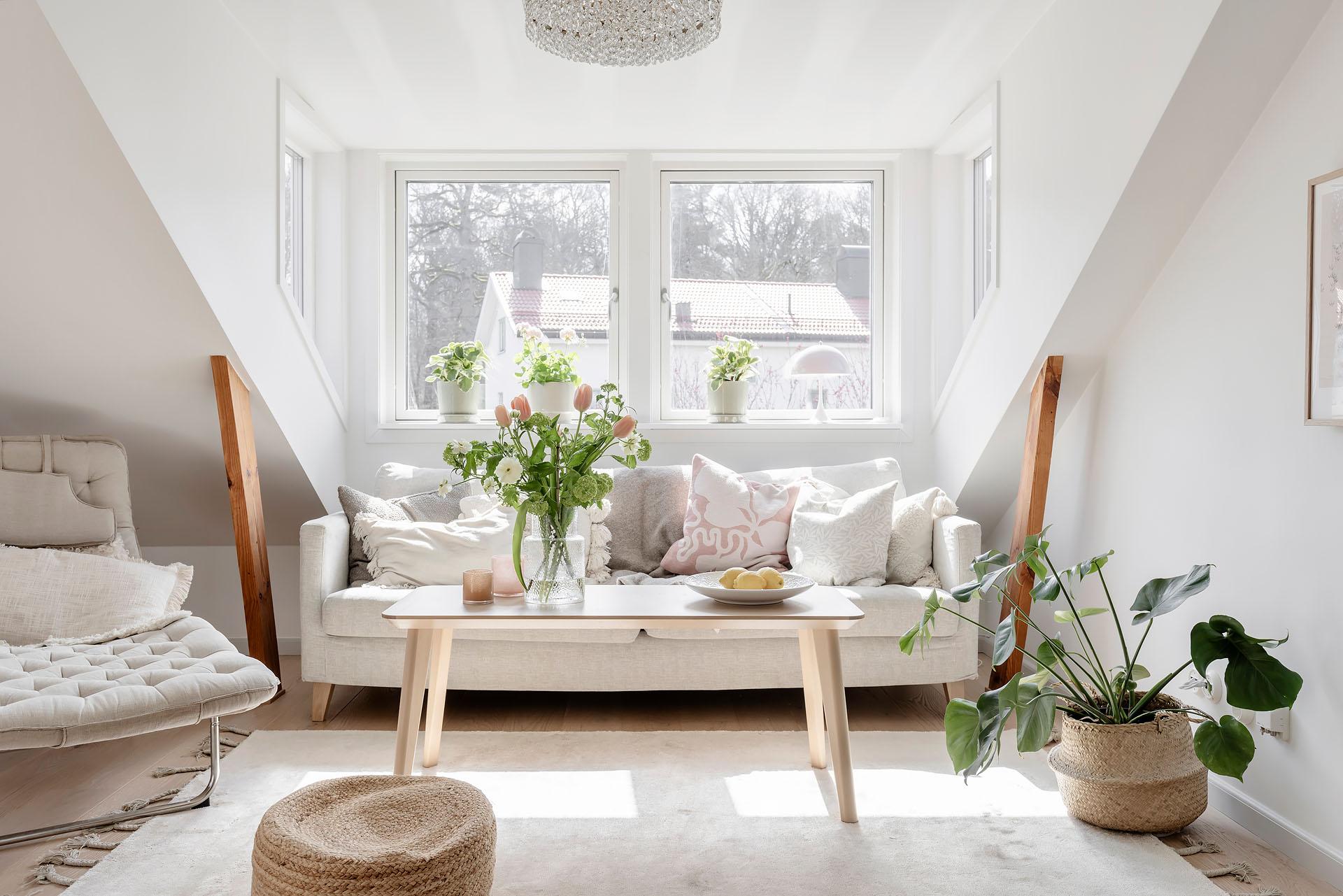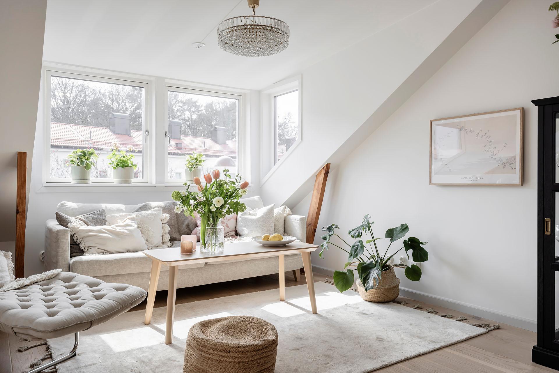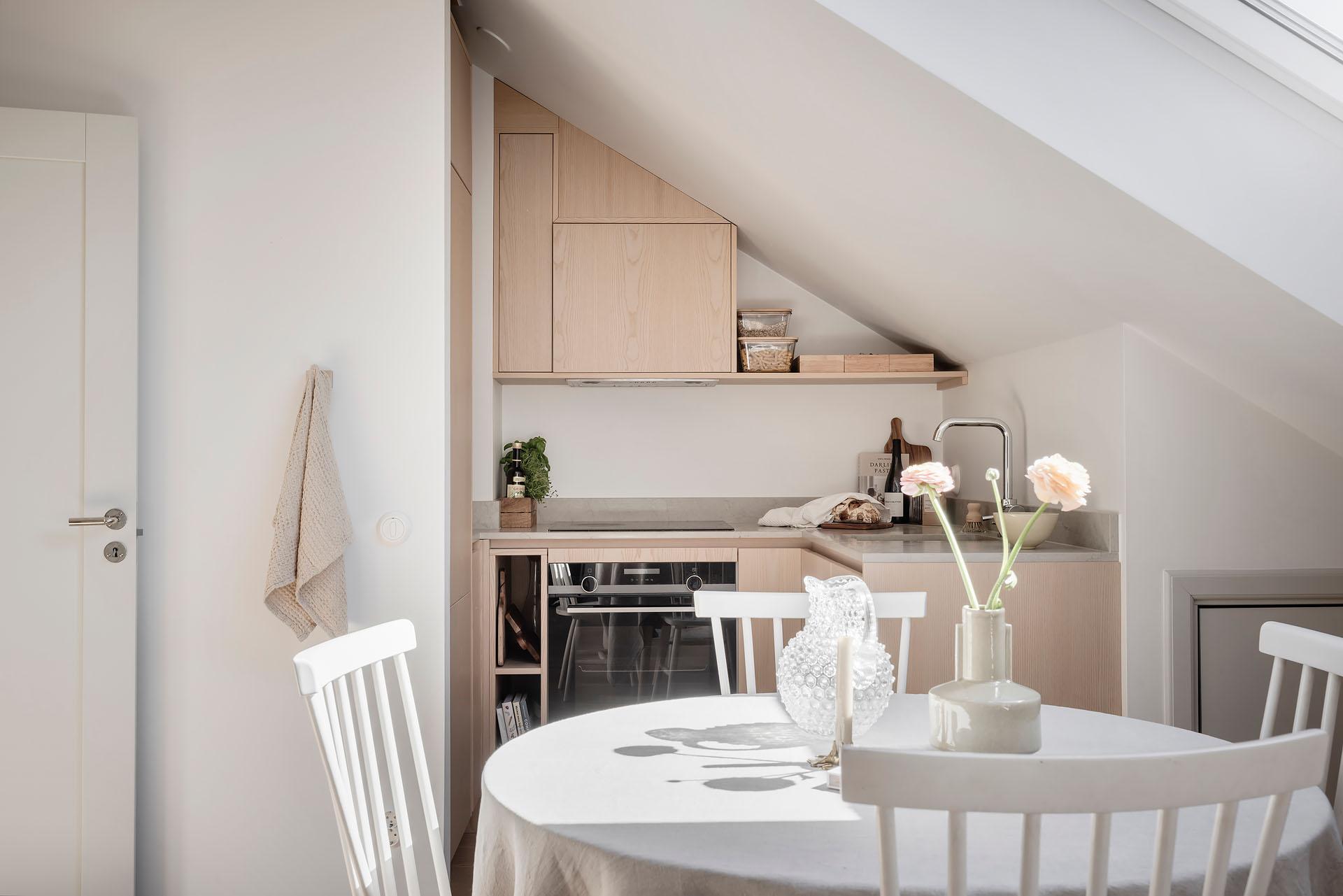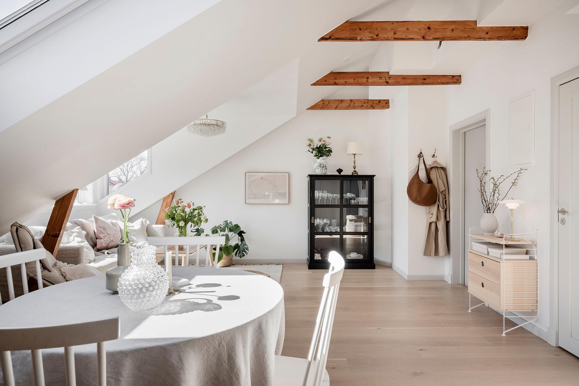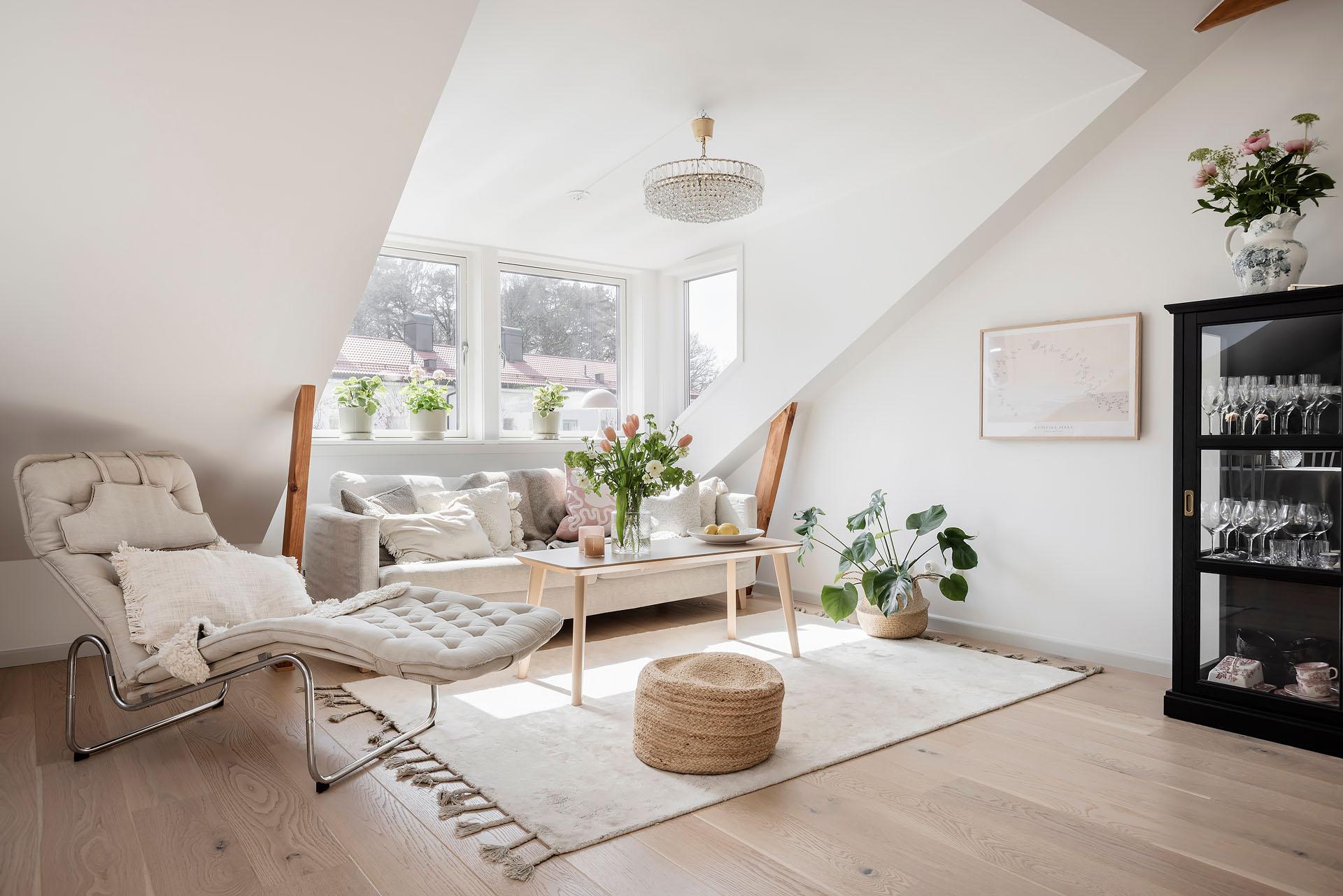 Den öppna planlösningen mellan vardagsrummet och köket bjuder in till umgänge, och det finns utrymme för att samla kompisgänget för trevliga middagar. Intill den fantastiska takkupan med fyra fönster i tre olika väderstreck har soffan sin givna plats. Liksom i övriga lägenheten är väggarna vitmålade och golvet belagt med enstavsparkett i vitpigmenterad ek från Tarkett.