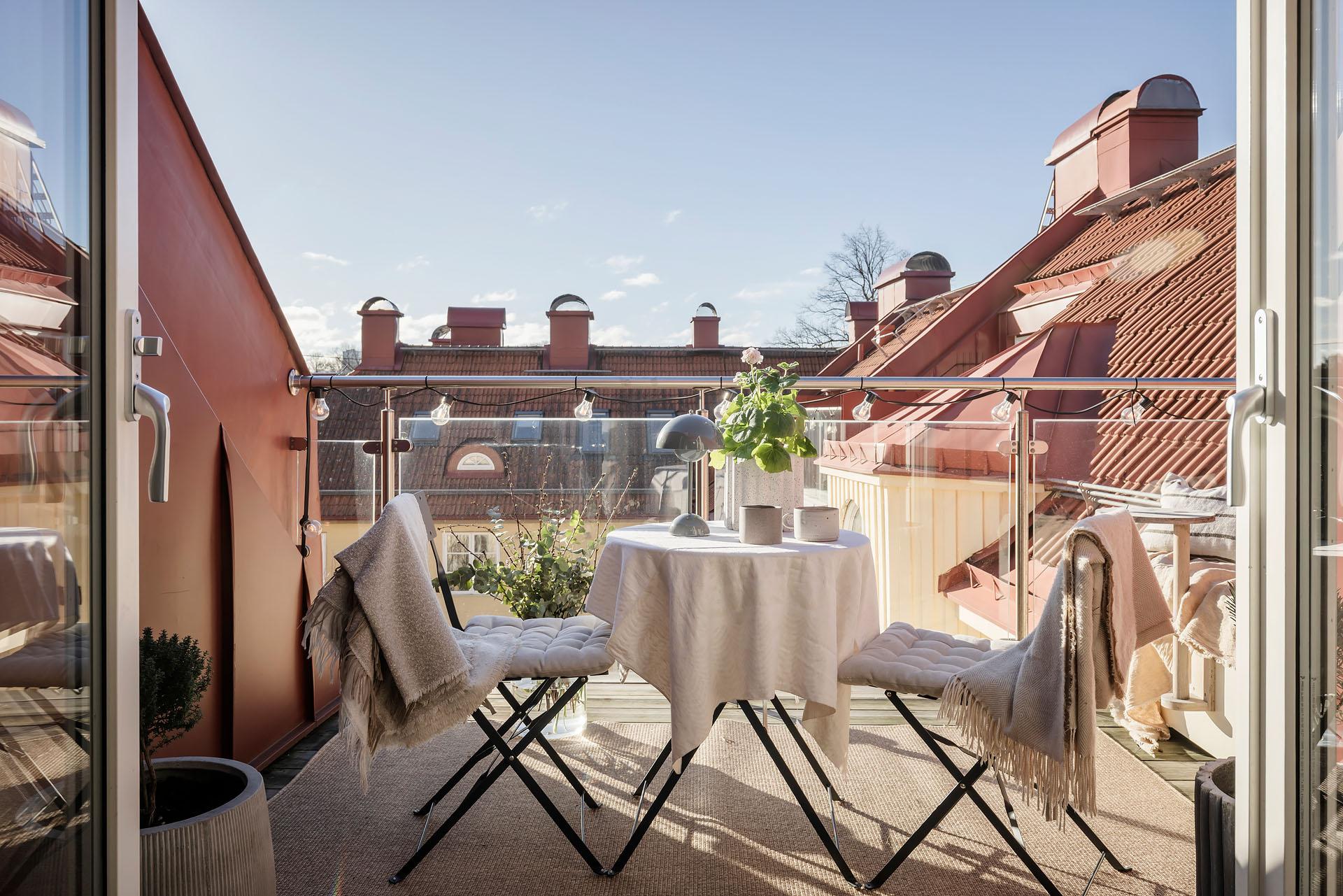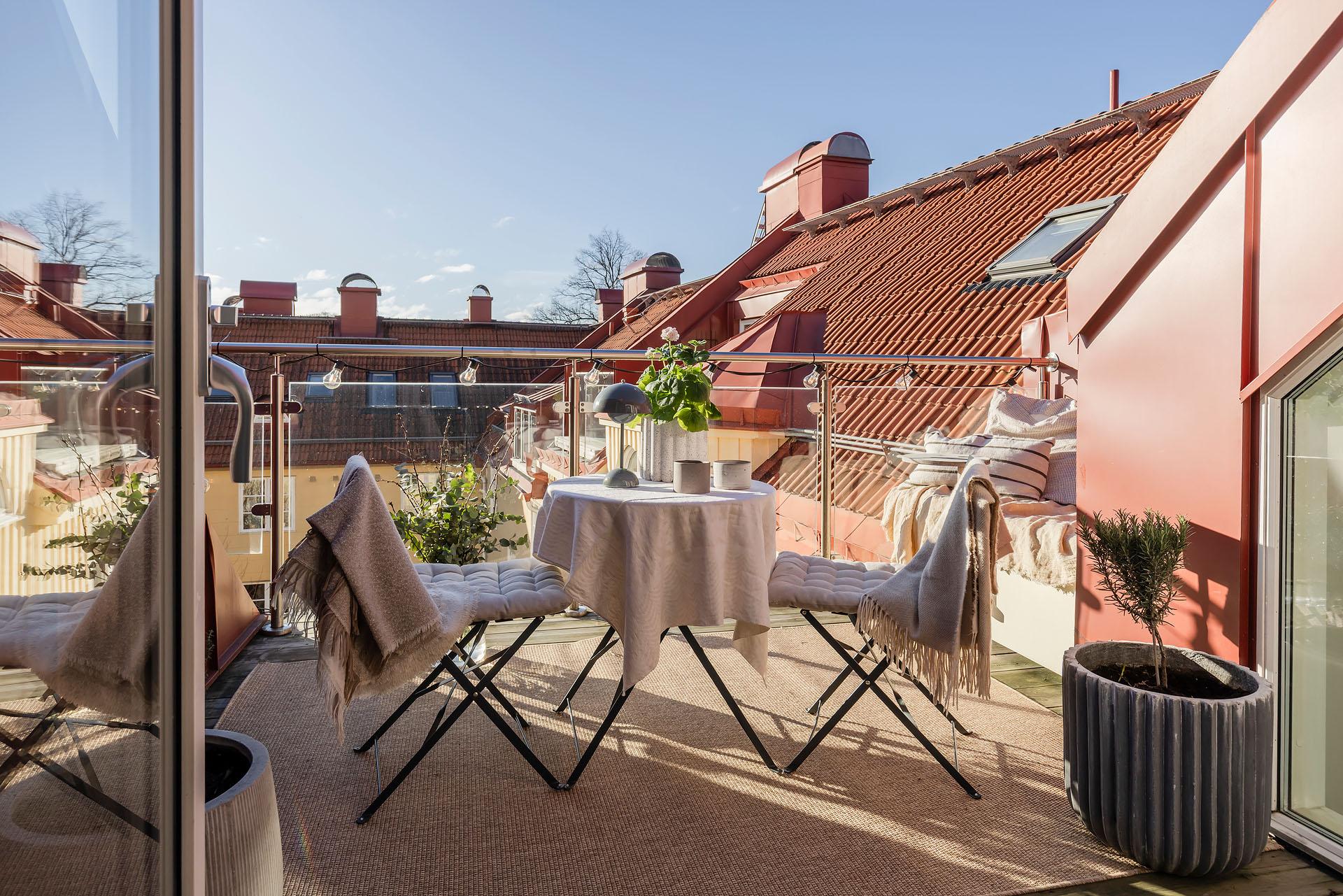 - Balkong/Uteplats: Ja. Takterrass i sydvästläge.
